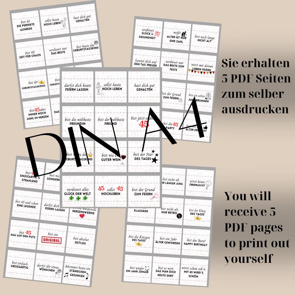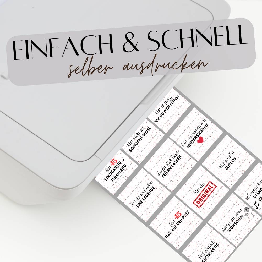 Hier erhälst Du eine Druckvorlage in DIN A4 Format als PDF Datei, als kleiner Aufmerksamkeit mit tollen Botschaften zum 45. Geburtstag als Duplo Geschenkidee.
