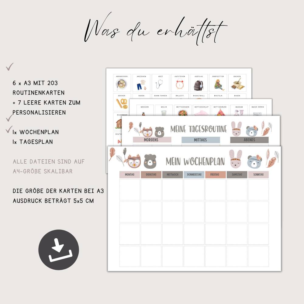Das Set enthält 203 verschiedene Routinekarten und 7 Blankokarten die ihr individuell gestalten könnt. Zusätzlich bekommt ihr einen Wochenplan und Tagesplan in A3 Format welches ihr aber auch in A4 ausdrucken könnt.