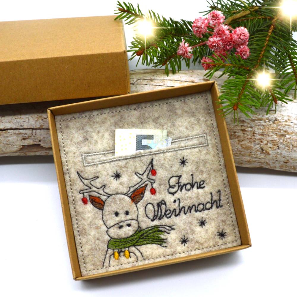 Verschenke Geld oder einen Gutschein zu Weihnachten, hübsch verpackt in diesem Wunscherfüller. Dieser wird mit einem kleinen Winterelch bestickt, der wärmend seinen Schal dabei hat.