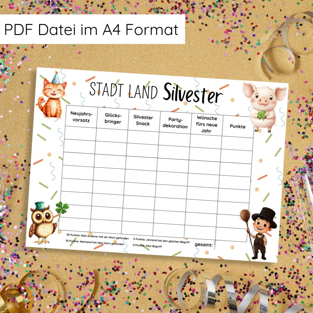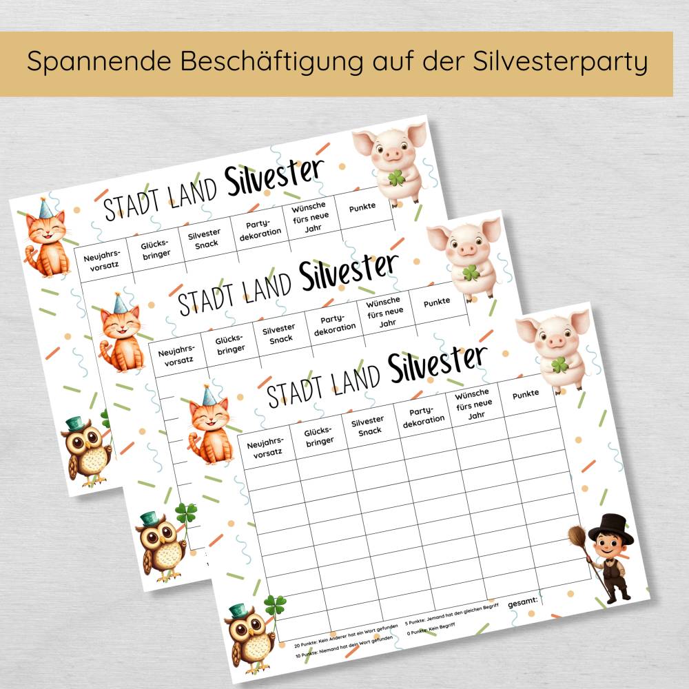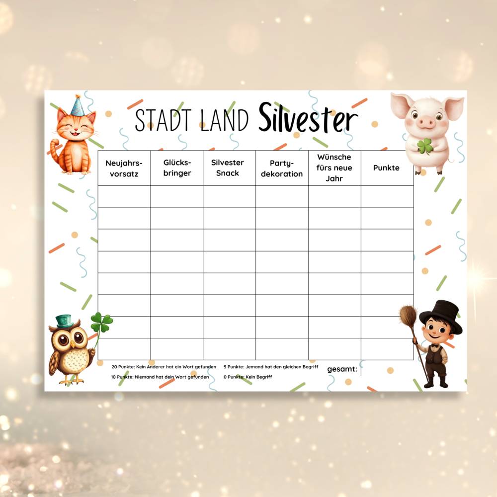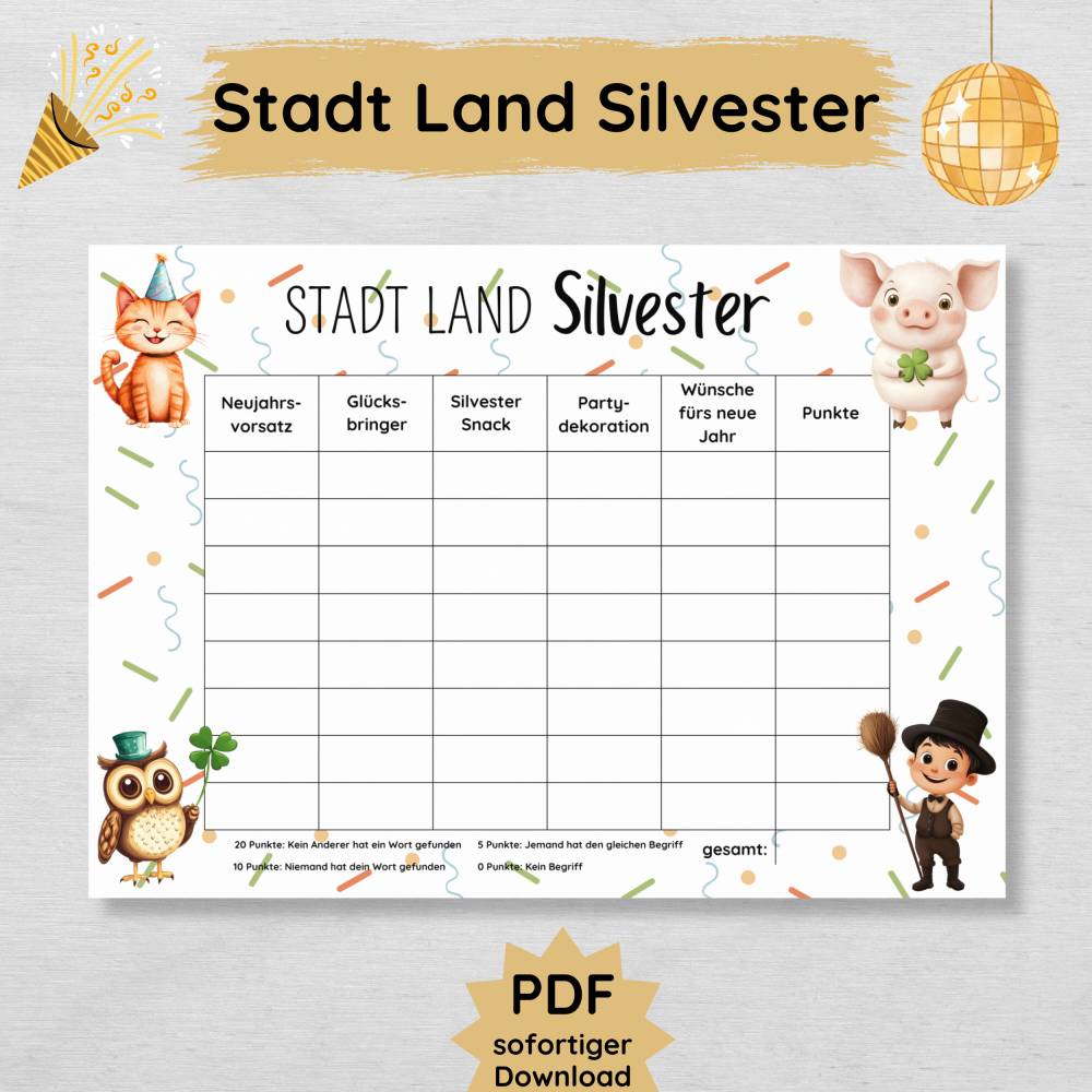 Stadt Land Silvester Spielvorlage für die ganze Familie, lustiges Partyspiel mit Kindern am Silvesterabend