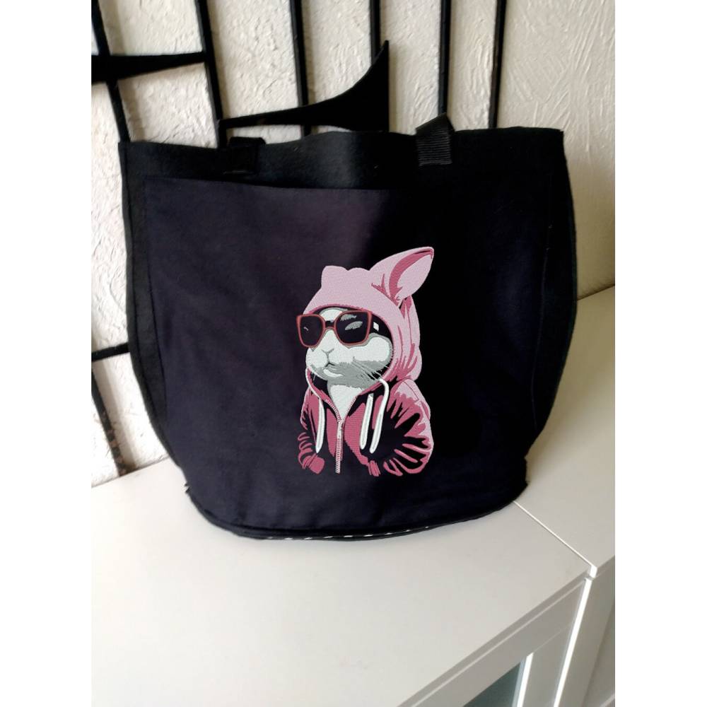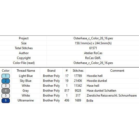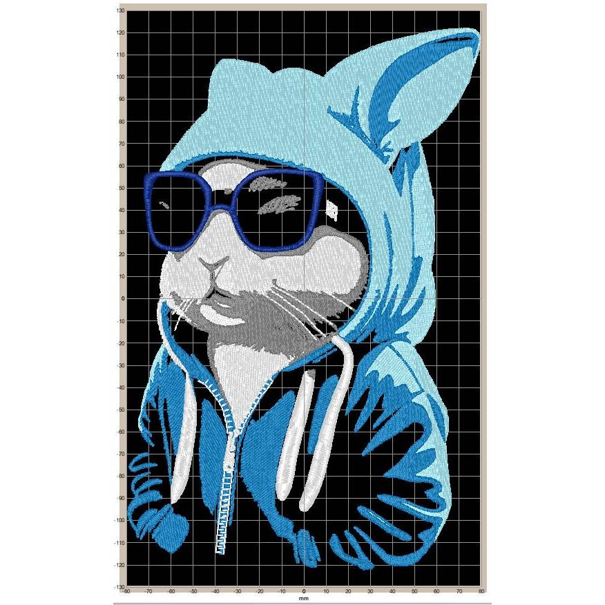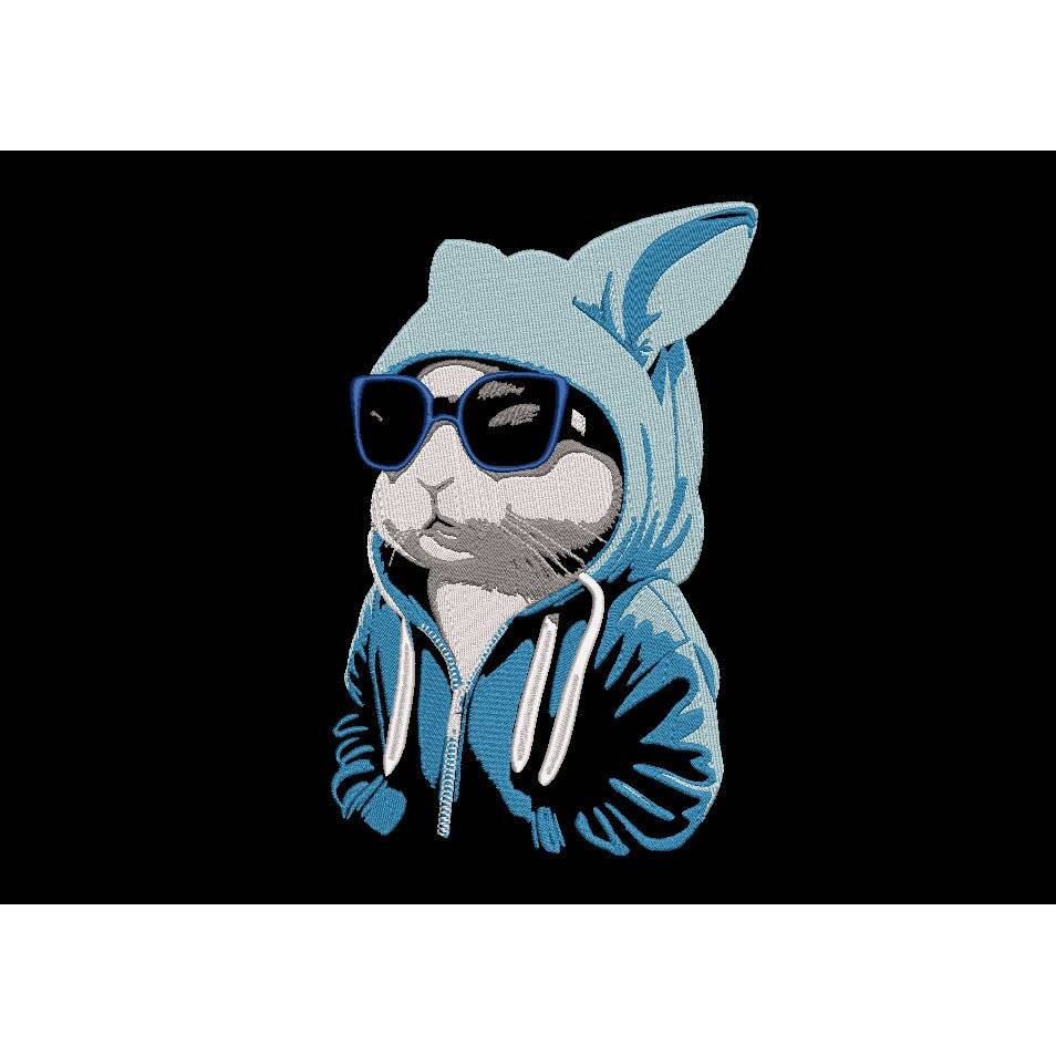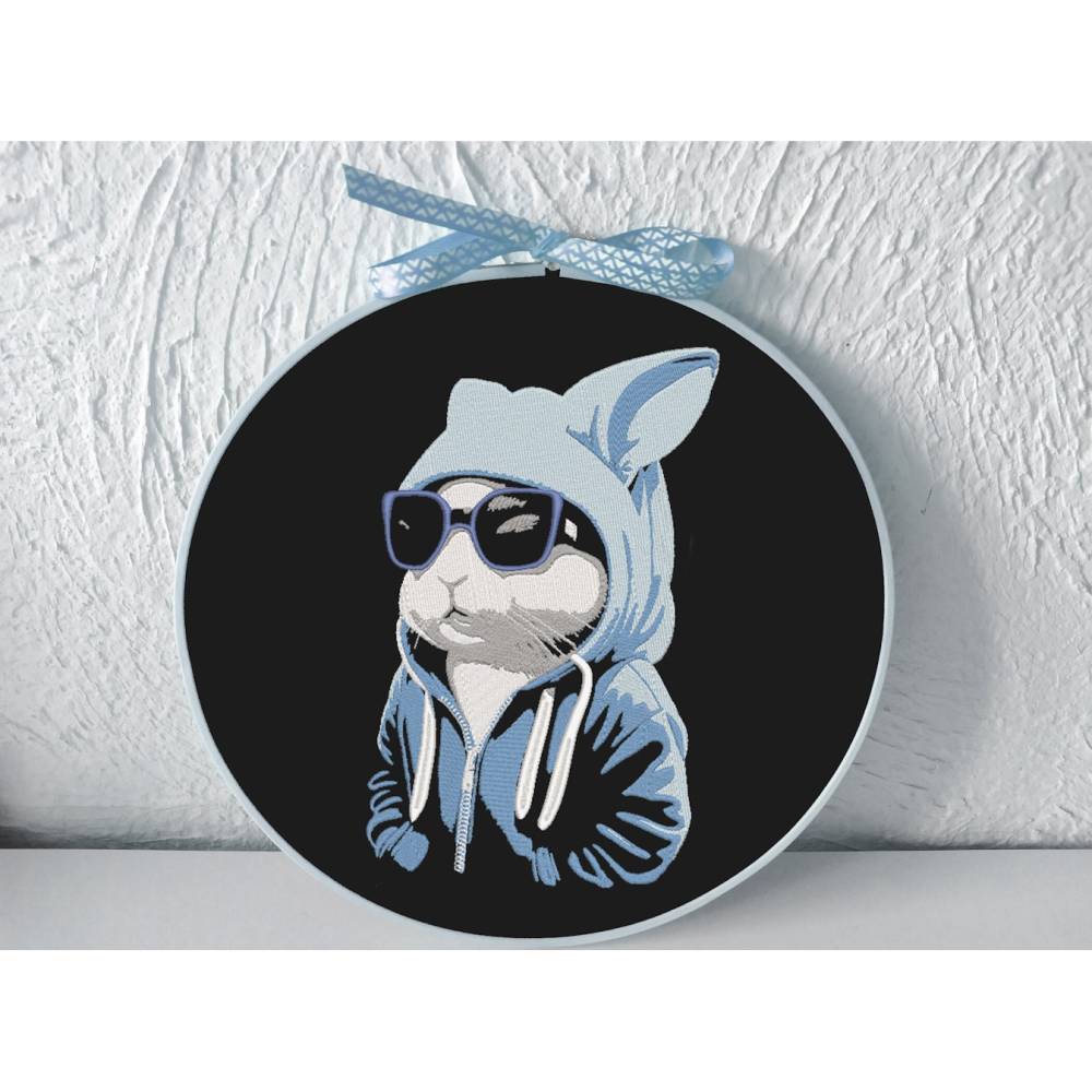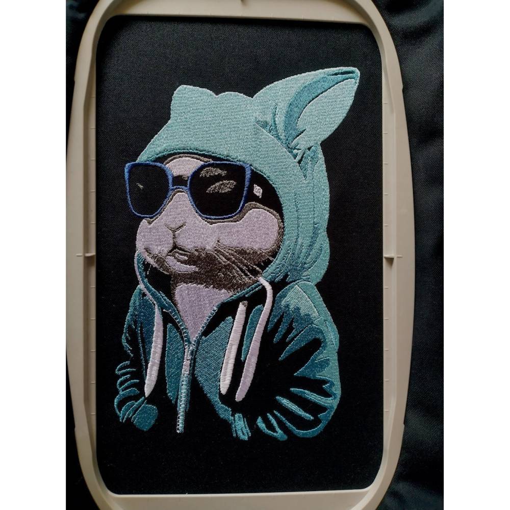 Entdecke die einzigartige Maschinen Stickdatei – Osterhase cool Color Lichteffekt! Dieses lustige Tiermotiv zeigt einen Hasen mit Sonnenbrille und Hoodie, perfekt inszeniert in fünf Farben und sechs Arbeitsschritten als beeindruckender Lichteffekt Color. Besonders cool: Im letzten Schritt stickst du die Motivstiche für den Reißverschluss am Hoodie und die Schnurrhaare des Hasen.
