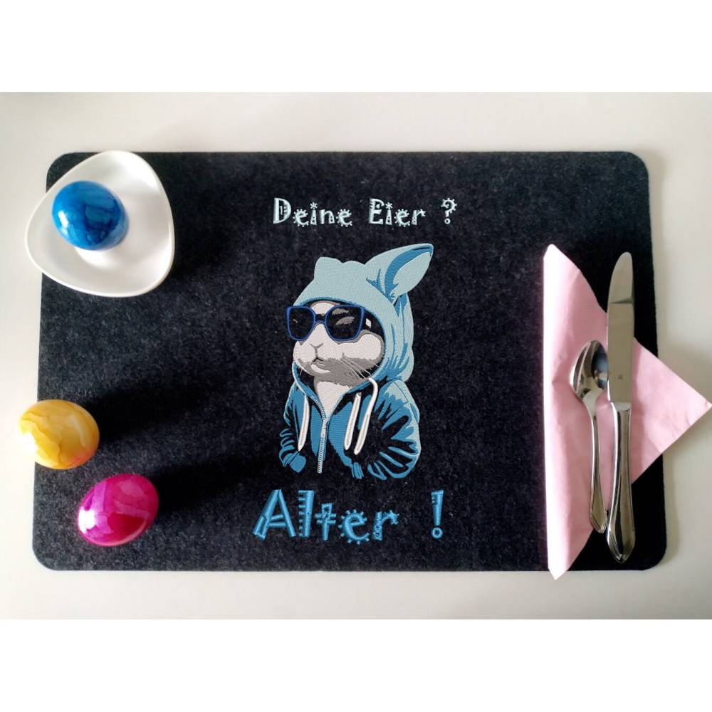 Du wolltest schon immer wissen, was der Osterhase in seiner Freizeit macht? Mit dieser Stickdatei hast du jetzt die Antwort und kannst das Motiv sogar farblich individuell gestalten – die Blautöne lassen sich ganz einfach austauschen. In den letzten Artikelbildern siehst du das Design auch in rosé und rot. Der Lichteffekt kommt nur auf sehr dunklen, bestenfalls schwarzen Textilien optimal zur Geltung.
