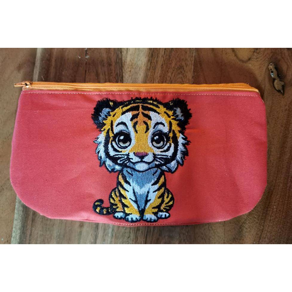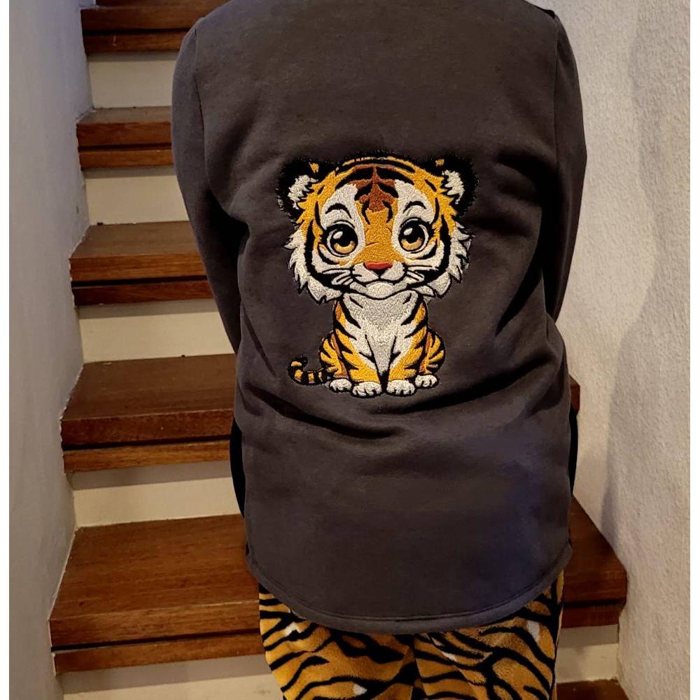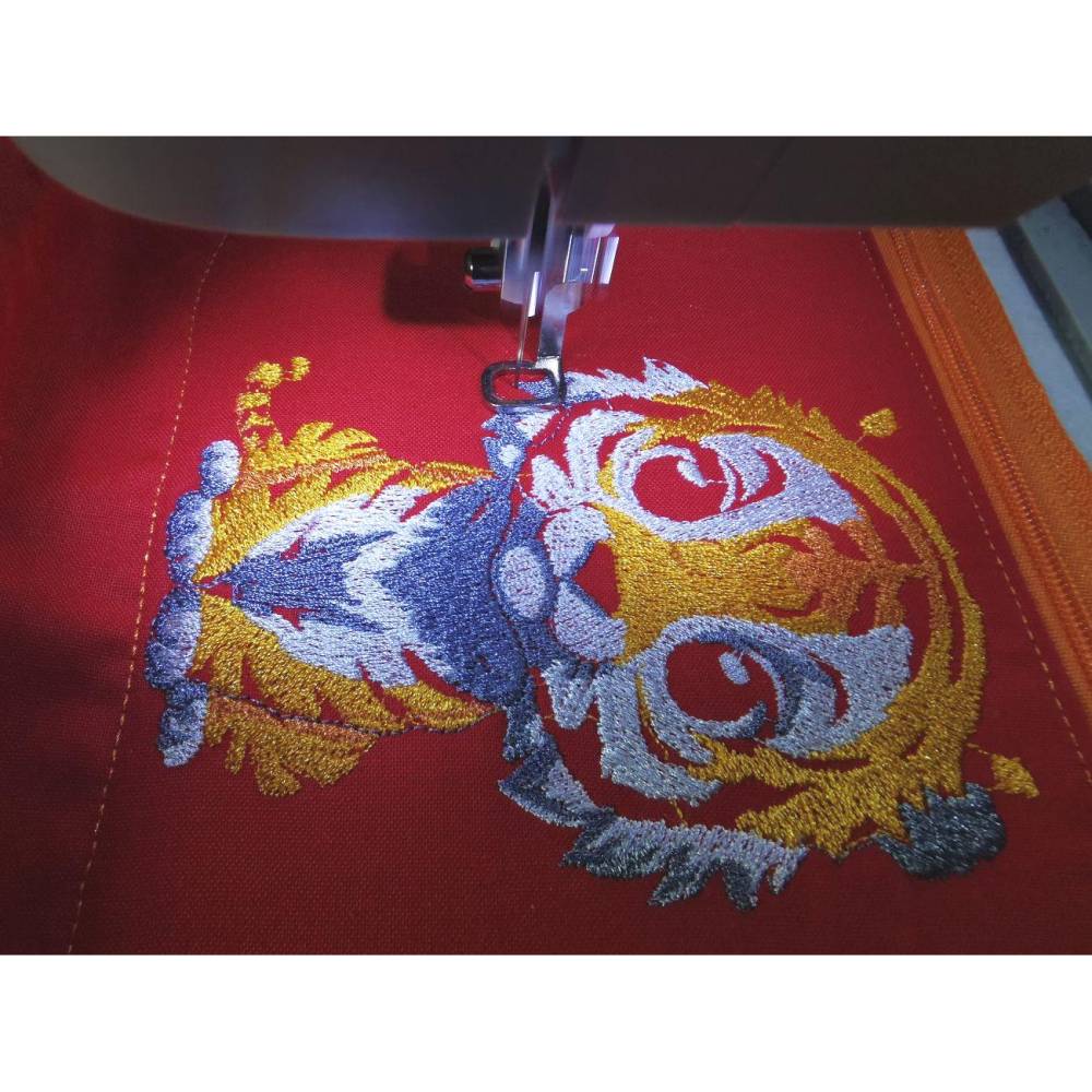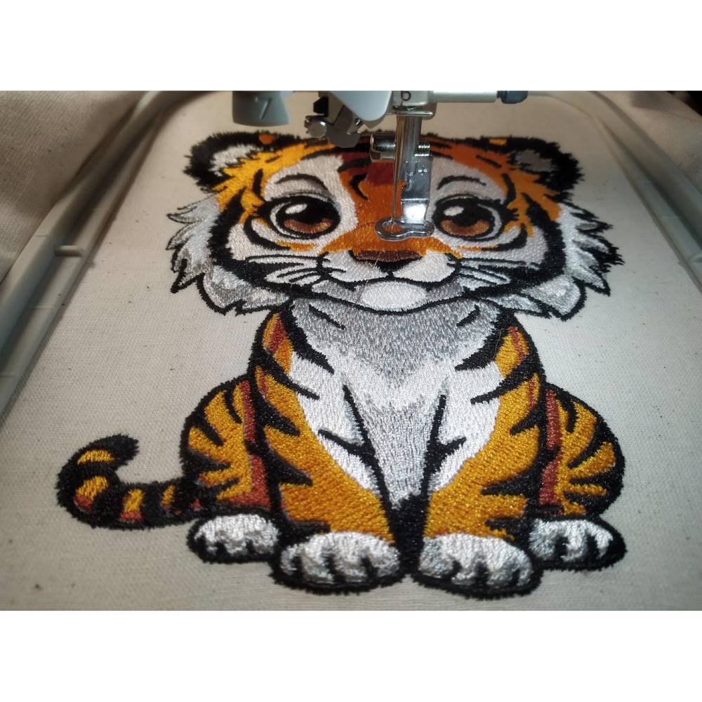Hübsches, vielseitiges Tiermotiv, ein Tiger, der niedlich dreinblickt. Die Augenfarbe kann man hier etwas variieren und die Augeniris ist in Satin gelegt, damit das Garn schön glänzt. Der obere schwarze Fellbereich ist etwas unregelmäßig gelegt um die Fellstruktur darzustellen, ebenso haben wir Handsticheffekt für den grauen Bereich am Hals verwendet. Diese Datei kann sehr gut mit Sprüchen und auch sehr gut mit ITH Projekten kombiniert werden. Nicht nur für Kinder ein Hingucker.
