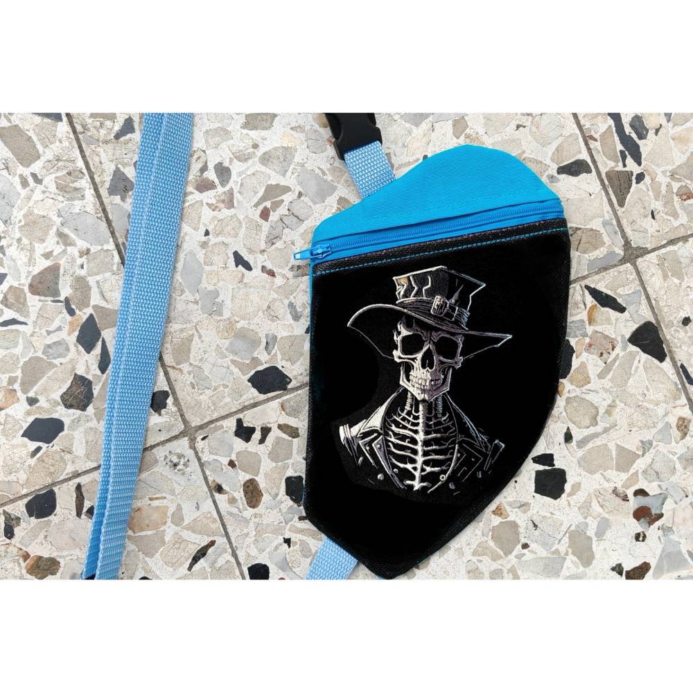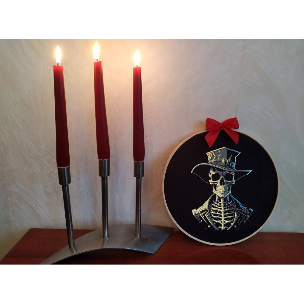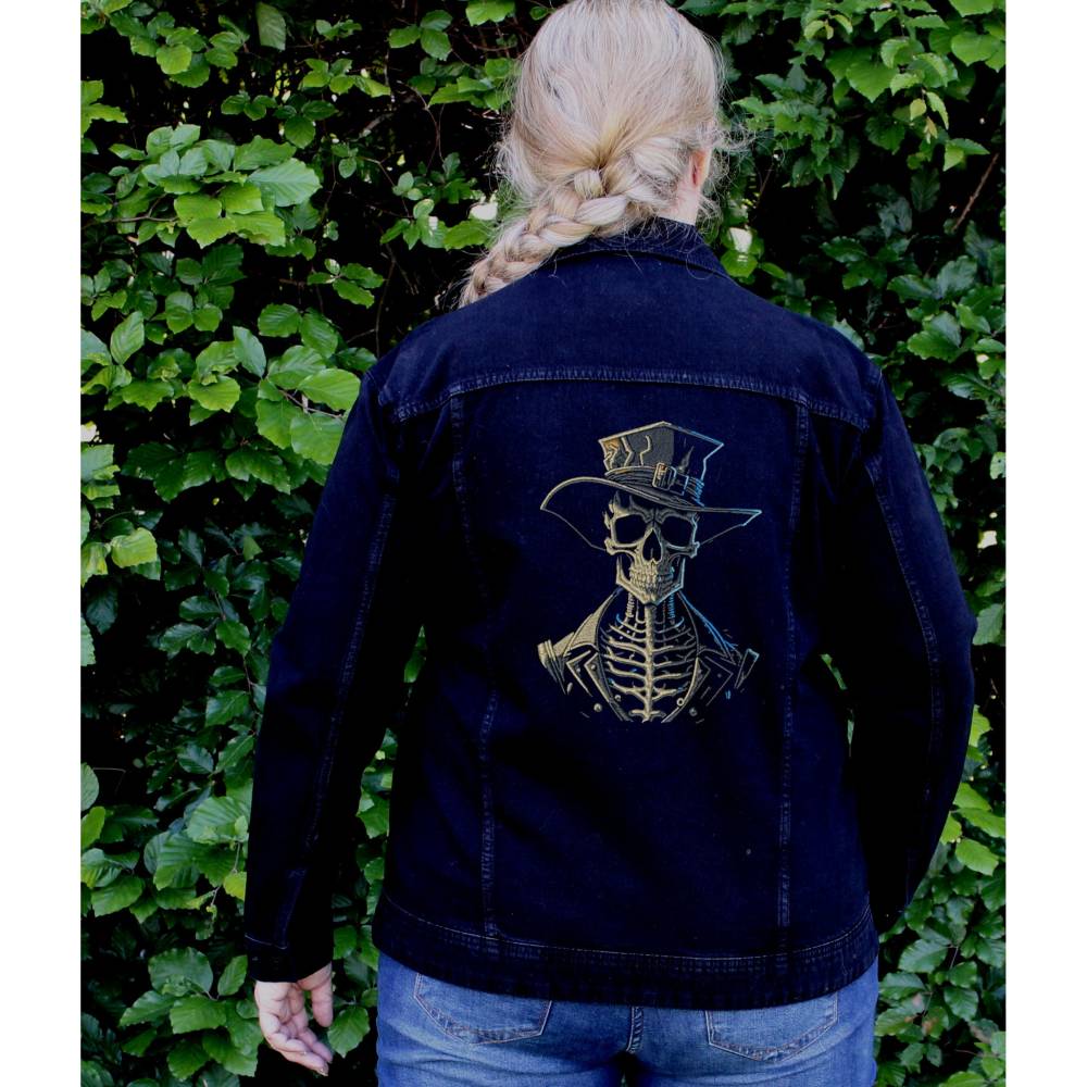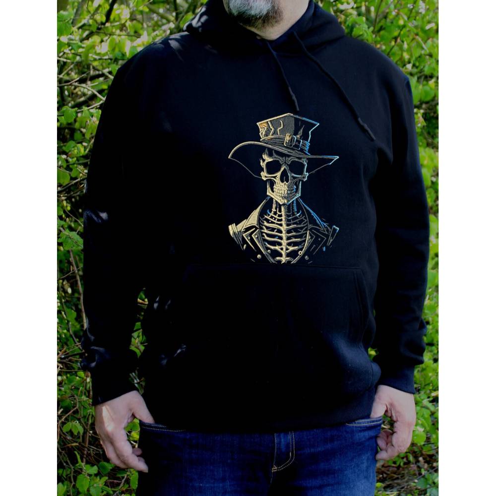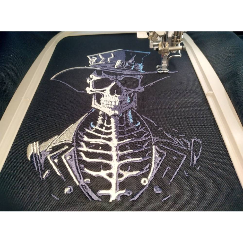 Schaurig, morbide Skelett Parodie herausgearbeitet mit mehrfachen Filtern und Effekten aus einer schönen Grafik, mit leichten stilistischen Steam Punk Anleihen. Gestickt auf dunklen Textilien entfaltet diese Datei das Spiel mit Licht und Schatten und kann auch über Karneval und Halloween hinaus für Furore sorgen. Dieses morbide Motiv lässt sich an der Maschine gut mit Sprüchen kombinieren. Leichte Satinakzenturierungen sorgen für den richtigen Glanz des Garnes.