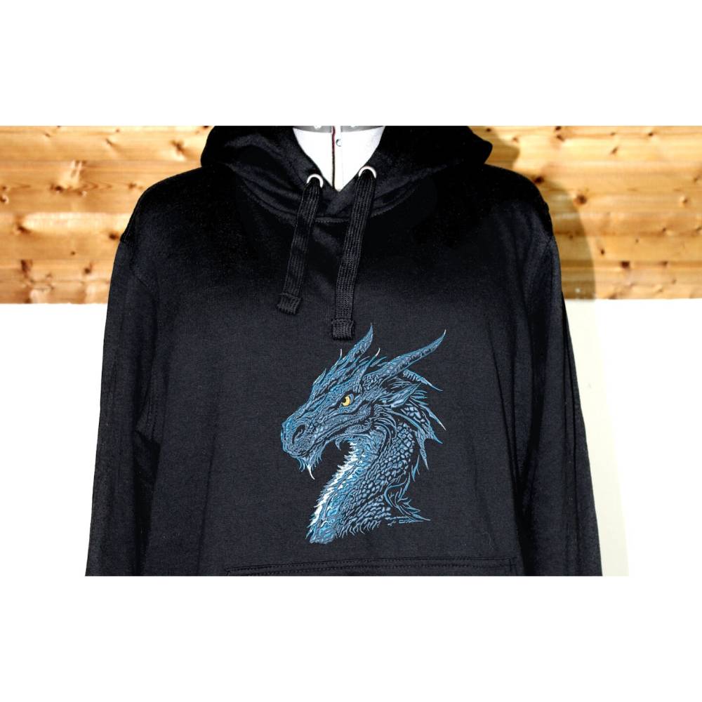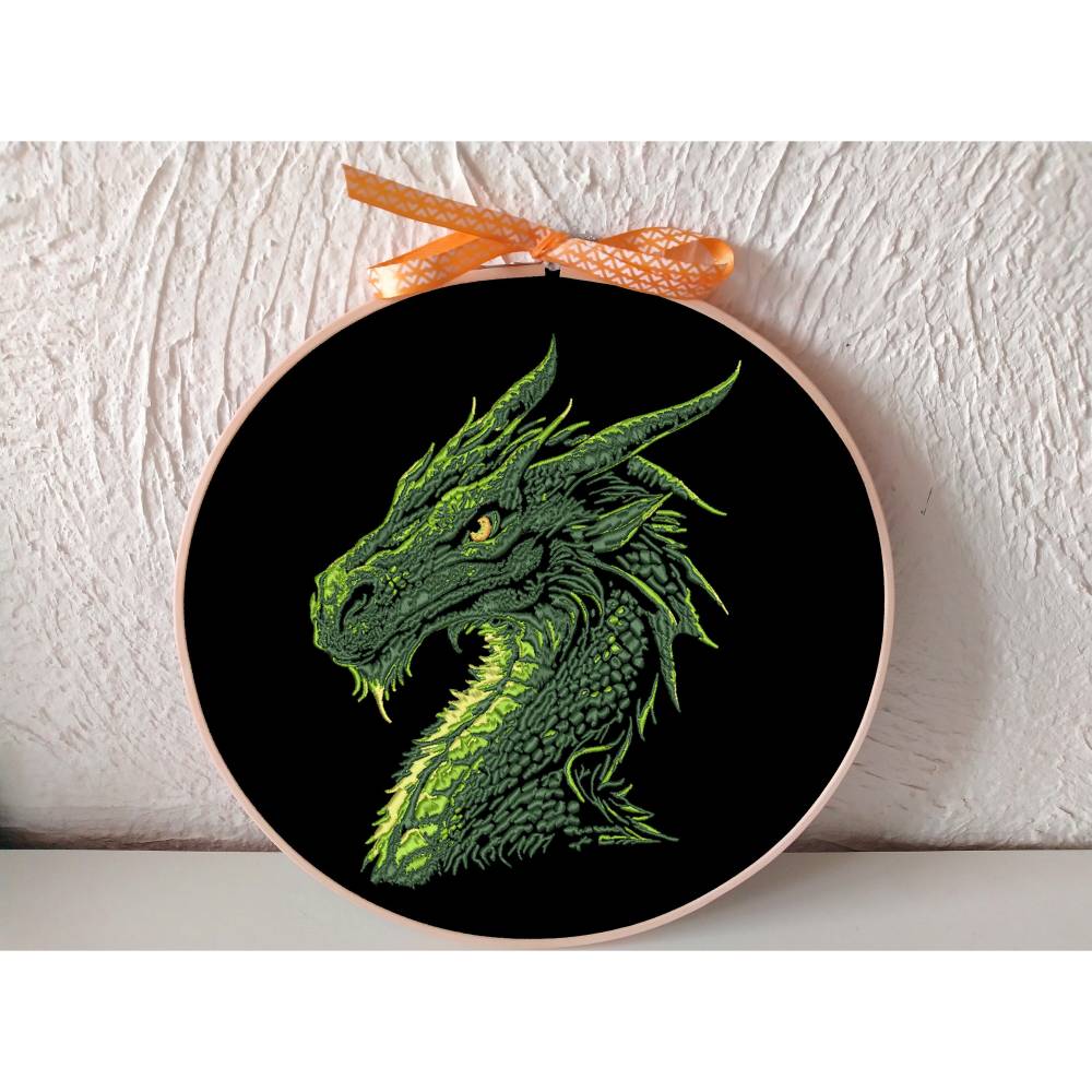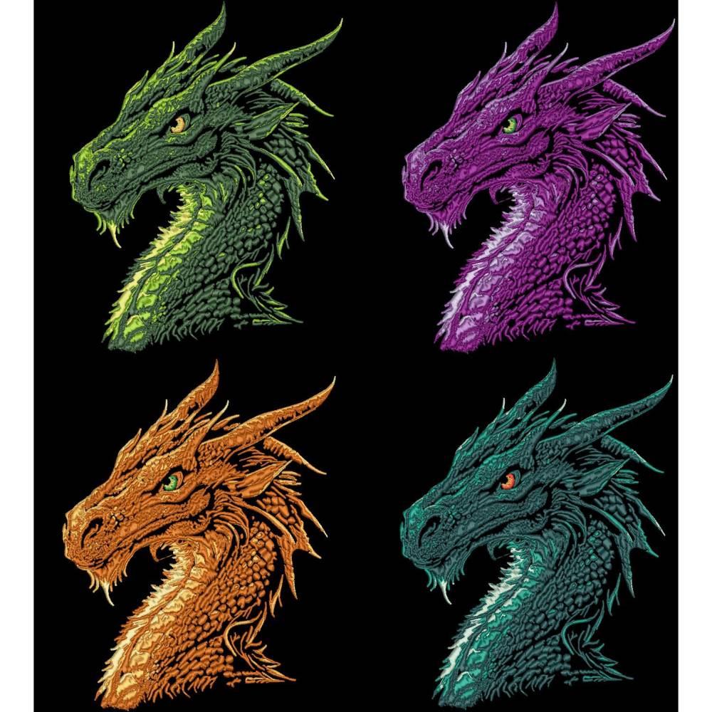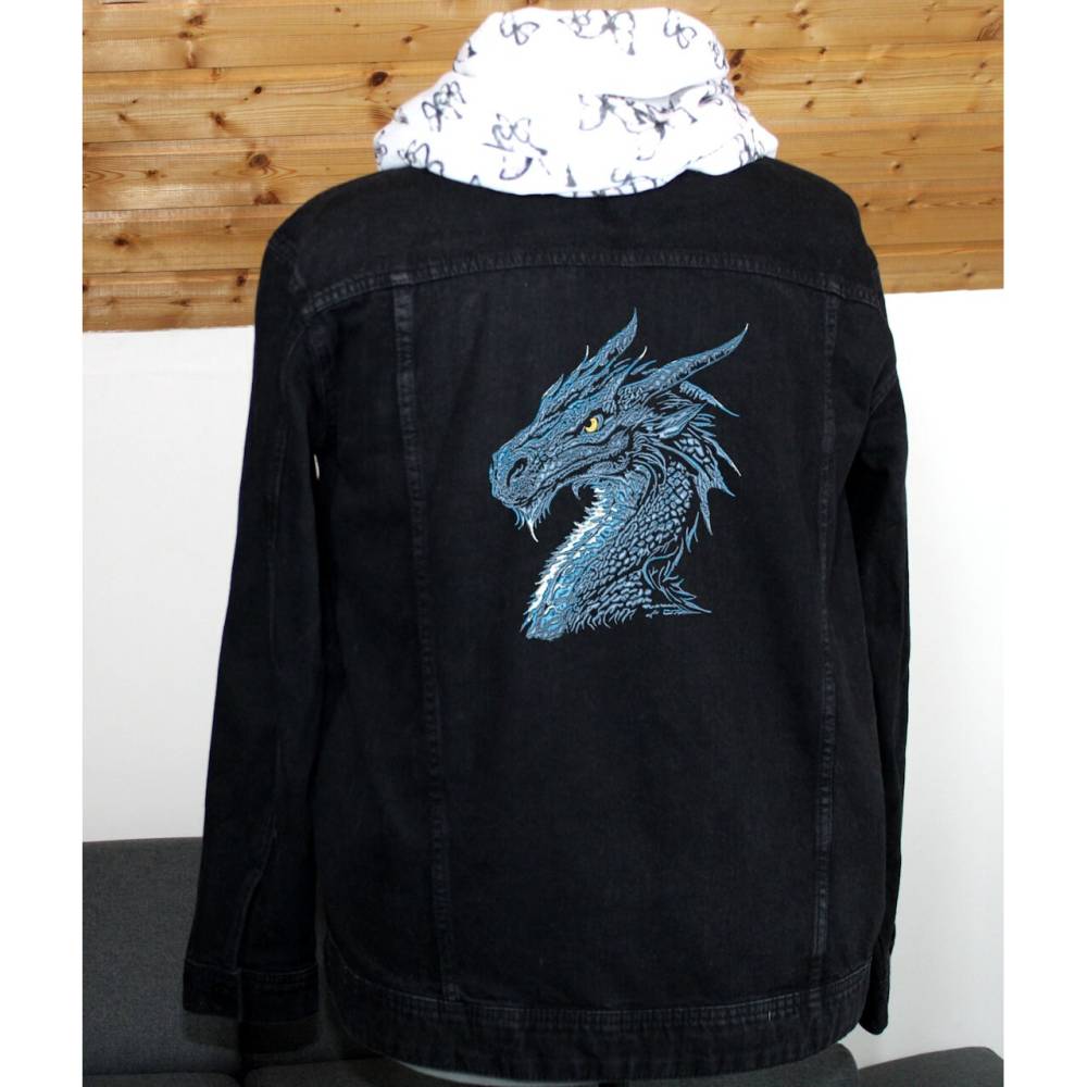 Ein cooler Drache, gestickt auf dunklen Textilien. Akzentuiert eingesetzte Motivstiche für die Hörner und die Schnauze, sowie in Satinstichen ausgearbeitete Augeniris in zwei Farben. Bei diesem Drachen können Sie nach Herzenslust colorieren. Wir haben mal Farblagen in anderen Farben als Beispiele in den Artikelbildern gezeigt. (Ausgeführt als Datei ist blau). Sie brauchen dazu drei Farben einer Farbfamilie von hell über mittel zu dunkel für den Drachen und zwei schöne Farben für die Augeniris, die in gutem Kontrast zum Drachen stehen. Besonders gut wirkt hier der Komplementärkontrast (Gegenüberliegende Farben im Farbkreis nach Itten).
