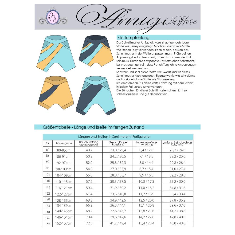 Das Schnittmuster ist in Echtgröße (du nähst hier nach echter Körpergröße) gradiert und enthält keine Nahtzugabe. Es umfasst die Größen 80 bis 152 und ist damit für eine Körpergröße zwischen 80 und 157cm geeignet. In den Dateien findest du die A4-Versionen zum Ausdrucken, eine A0-Datei sowie die Beamerdatei - alle Versionen inkl. Ebenen zum Ein- und Ausblenden der Größen. Amigo Hose ist auf Jersey und je nach Figurtyp auch auf French Terry ausgelegt.