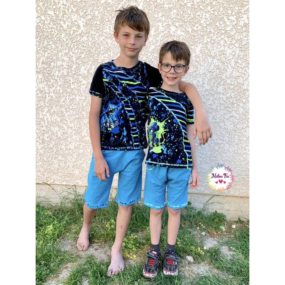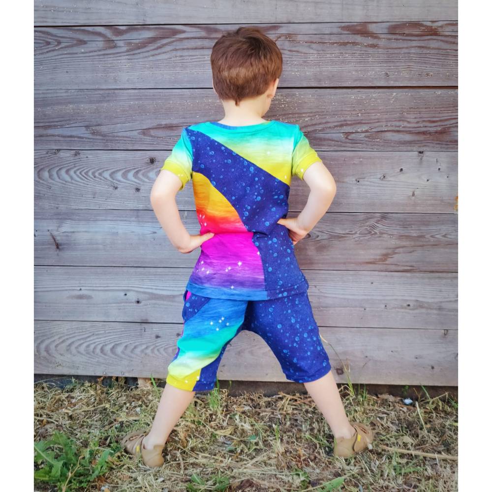 Amigo ist eine lockere und einfach zu nähende Sommerhose mit der man prima spielen kann und trotzdem immer cool aussieht. Das Schnittmuster verfügt über tolle Teilungen, die je nach Geschmack umgesetzt werden können. Das Schnittmuster verfügt über zwei Längen, welche auf einen Abschlusssaum ausgelegt sind aber mit einem Abschlussbündchen variiert werden können. Große Taschen mit Bündcheneingriffen sind praktisch und passen prima zu den Teilungen des Schnittes. Amigo als Hose verfügt aufgrund seiner Gestaltung nicht über eine Schrittnaht was zu einer entspannten Passform führt. Das Bauchbündchen ist beim Schnittmuster enthalten, kann bei Bedarf aber auch selbst angefertigt werden. Bei dieser Hose kann man auch für Jungs richtig cool gestalten - so sind Paspeln, Covernähte oder Labels perfekt geeignet, um die Teilungen noch einmal so richtig zu pimpen! Passend zur Hose Amigo gibt es übrigens auch das Schnittmuster zu einem Shirt - ebenfalls unter dem Namen Amigo - welches die Teilungen der Hose spiegelt.
