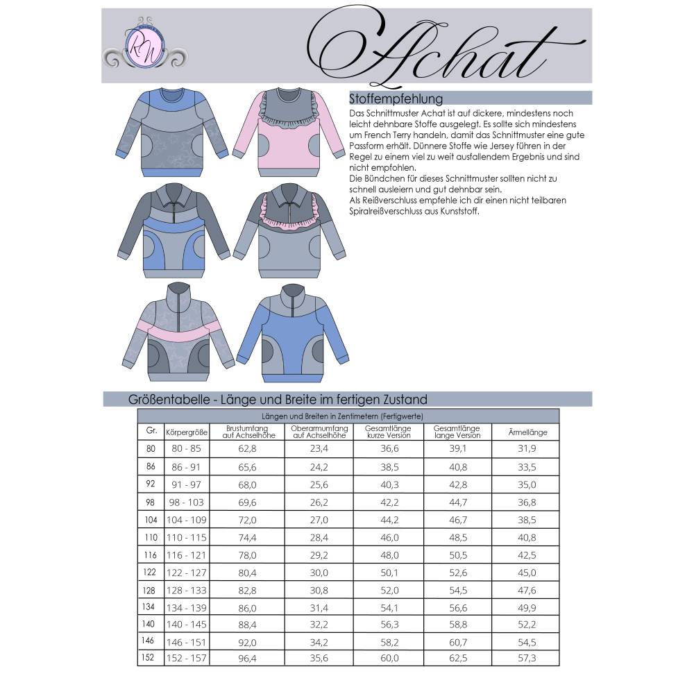 Das Schnittmuster ist in Echtgröße (du nähst hier nach echter Körpergröße) gradiert und enthält keine Naht- und Saumzugabe. Es umfasst die Größen 80 bis 152 und ist damit für eine Körpergröße zwischen 80 und 157cm geeignet. In den Dateien findest du die A4-Versionen zum Ausdrucken, eine Großdruckdatei sowie die Beamerdatei - alle Versionen inkl. Ebenen zum Ein- und Ausblenden der Größen. Achat ist auf dickere, noch dehnbare Stoffe ausgelegt. Verwendbar sind z.B. Sweat, French Terry, Fleece usw.