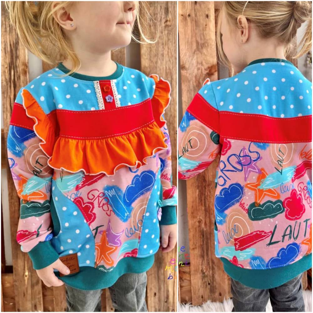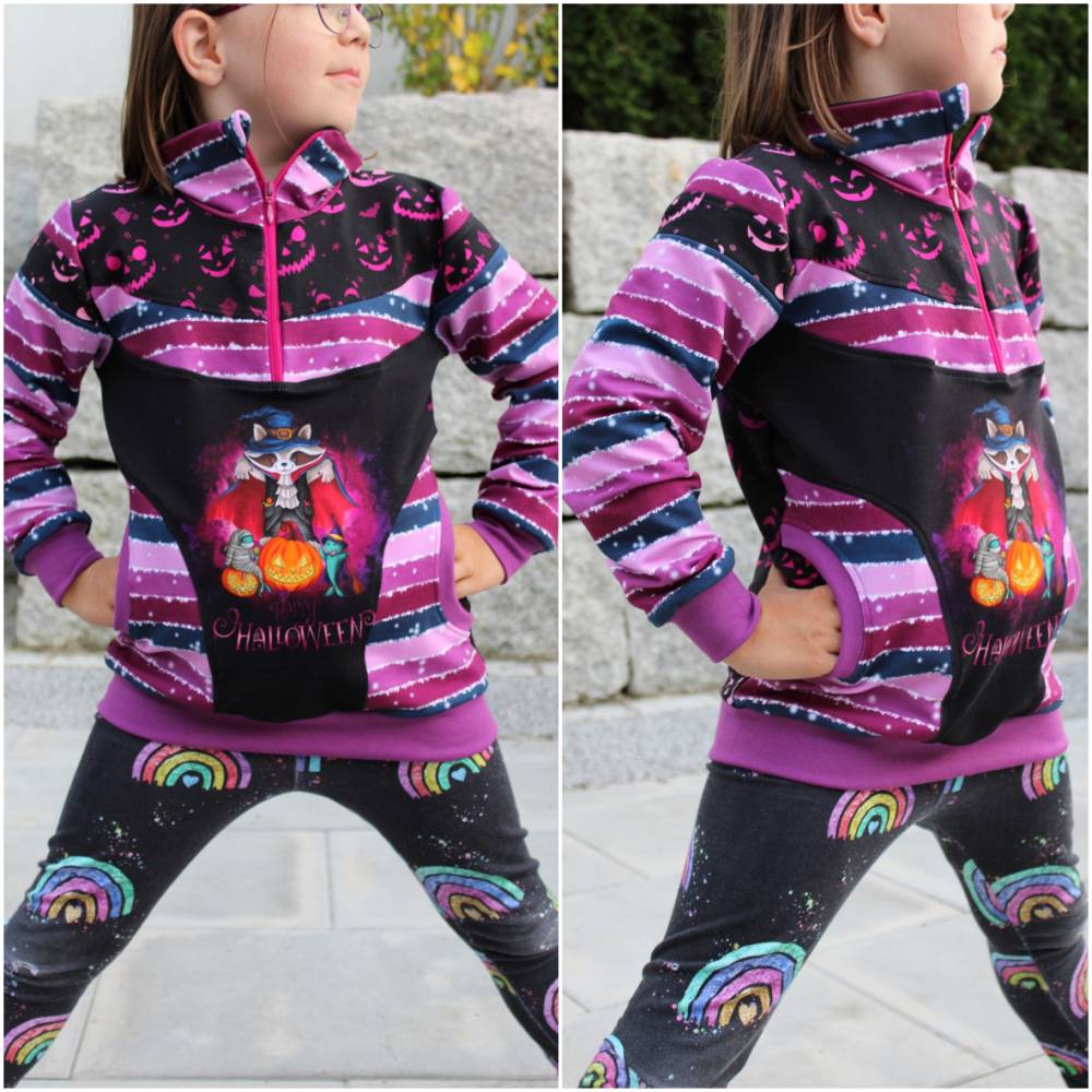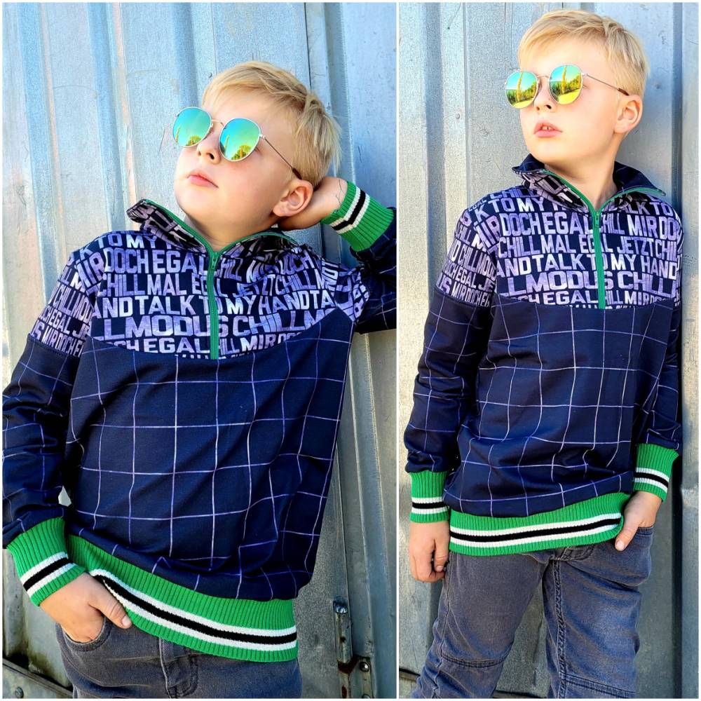 Achat ist ein bequemer Pulli für dickere Stoffe. Also perfekt für die kühleren Tage. Das Schnittmuster bietet dir viele Teilungsoptionen die von meinen Achatschnecken inspiriert sind :)! Diese kannst du wahlweise einzeln oder gemeinsam umsetzen. Ein weiteres wichtiges Detail am Schnittmuster ist der Kragen mit Reißverschluss. Diesen gibt es in einer kürzeren Variante, die geschlossen getragen werden kann und in einer längeren Variante, welche grundsätzlich offen und umgelegt getragen wird. Beide Kragenvarianten werden mit Reißverschluss genäht. Das Nähen des Reißverschlusses ist einfach und genau erklärt, sodass es dir auch gelingt, wenn du zuvor noch nicht mit einem Reißverschluss gearbeitet hast. Verwendet wird dazu ein einfacher, nicht teilbarer Sprial- Reißverschluss aus Kunststoff. Dieser ist günstig erhältlich und lässt sich toll einnähen. Ebenfalls benötigt wird zur Verstärkung bügelbares Vlies H250. Möchtest du deinen Achat lieber ohne Reißverschluss nähen, kannst du natürlich auch jederzeit auf ein Halsbündchen zurückgreifen. Neben den Teilungen und den Kragenoptionen kann Achat mit einer großen und einer kleinen Taschenversion genäht werden. Vervollständigt wird das Schnittmuster durch Bündchen an allen Abschlüssen, zwei optionale Grundlängen und optionale Rüschen für die oberen Teilungen.