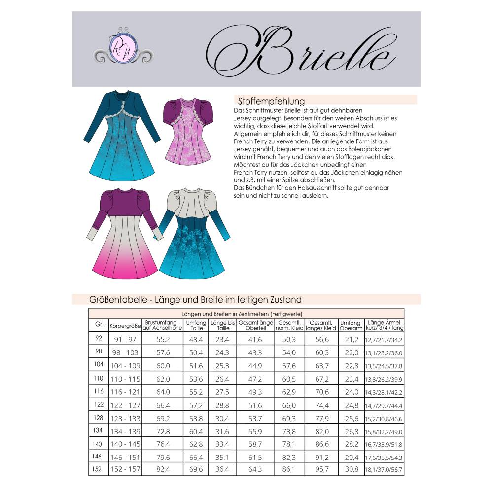 Das Schnittmuster ist in Echtgröße (du nähst hier nach echter Körpergröße) gradiert und enthält keine Naht- und Saumzugabe. Es umfasst die Größen 92 bis 152 und ist damit für eine Körpergröße zwischen 92 und 157cm geeignet. In den Dateien findest du die A4-Versionen zum Ausdrucken, eine Großdruckdatei sowie die Beamerdatei - alle Versionen inkl. Ebenen zum Ein- und Ausblenden der Größen. Brielle ist auf Jersey und Bündchenware ausgelegt.