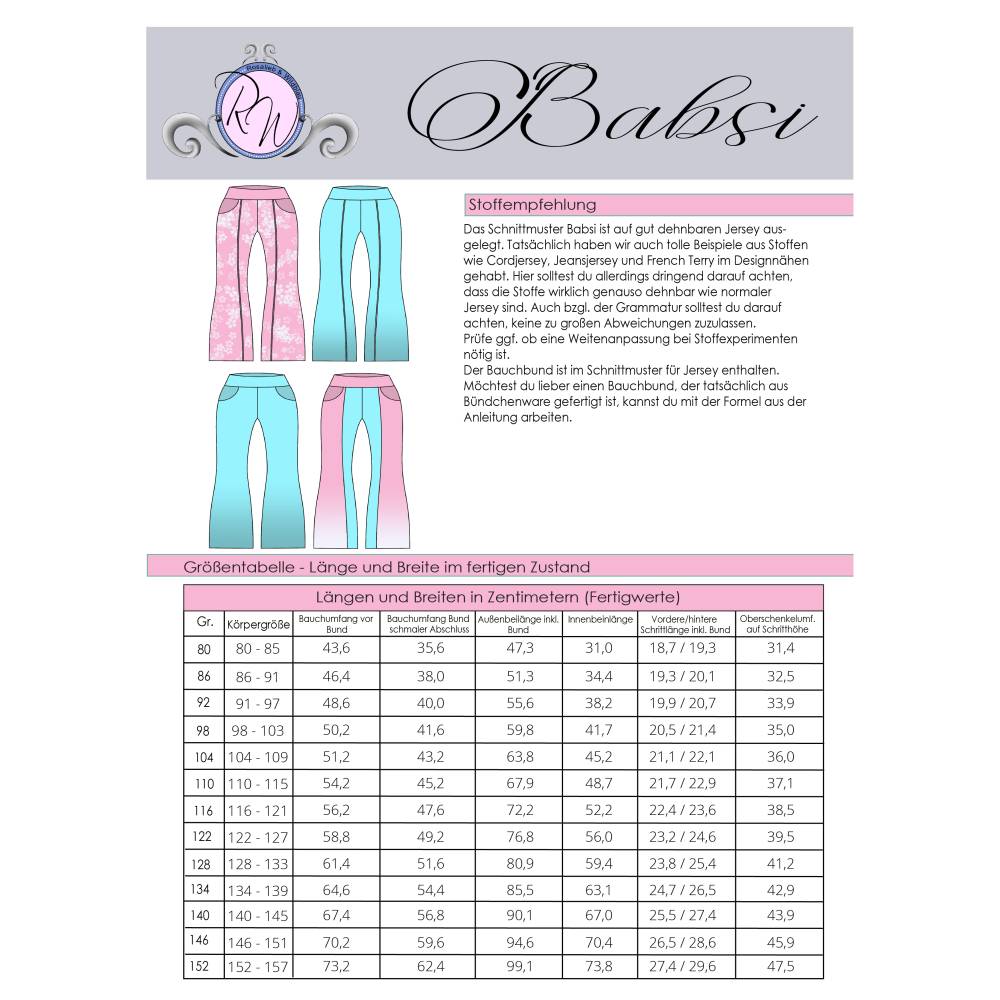 Das Schnittmuster ist in Echtgröße (du nähst hier nach echter Körpergröße) gradiert und enthält keine Naht- und Saumzugabe. Es umfasst die Größen 80 bis 152 und ist damit für eine Körpergröße zwischen 80 und 157cm geeignet. In den Dateien findest du die A4-Versionen zum Ausdrucken, eine A0-Datei sowie die Beamerdatei - alle Versionen inkl. Ebenen zum Ein- und Ausblenden der Größen. Babsi ist grundsätzlich auf Jersey ausgelegt.