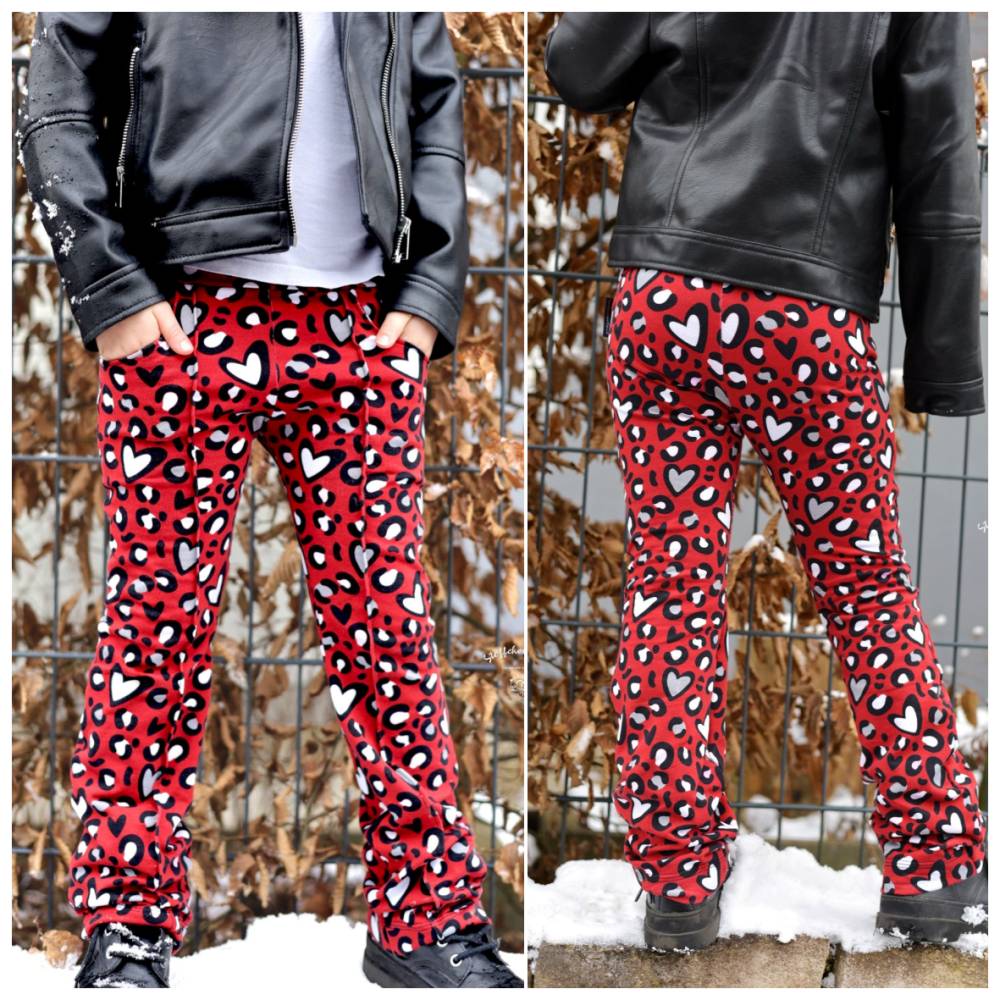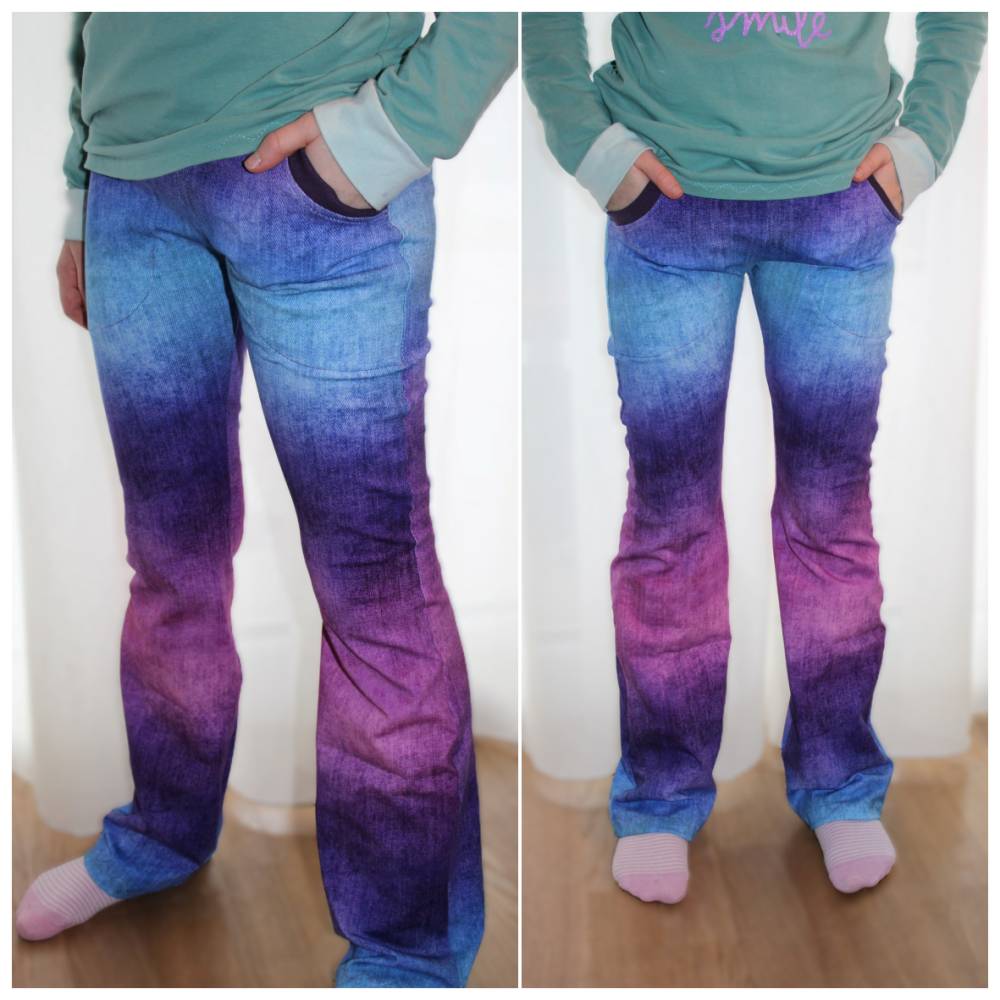 Das Schnittmuster Babsi ist eine einfache und schnell genäht Hose. Ihr besonderes Merkmal ist unter anderem der weite Beinabschluss. Dieser Abschluss steht im Kontrast zur sonst schmal geformten Hose. Optional kann Babsi mit einer integrierten Biese genäht werden, welche zum Abschluss hin innenliegend am Bein entlang geformt verläuft. Alternativ kann die Linie auch als Teilung genutzt werden, indem man den Schnitt entlang der Biesenlinie teilt. Ganz ohne Teilungen oder Biesen ist Babsi ebenfalls nähbar und eine tolle Ergänzung für Mädelsoutfits. Bei Babsi hast du die Wahl mit oder ohne Taschen zu nähen - die Tascheneingriffe werden ohne Bündchen genäht. Für den Bauchabschluss ist ein Schnittmusterteil für Jerseystoffe enthalten. Der allgemeine Abschluss wird bei Babsi gesäumt.
