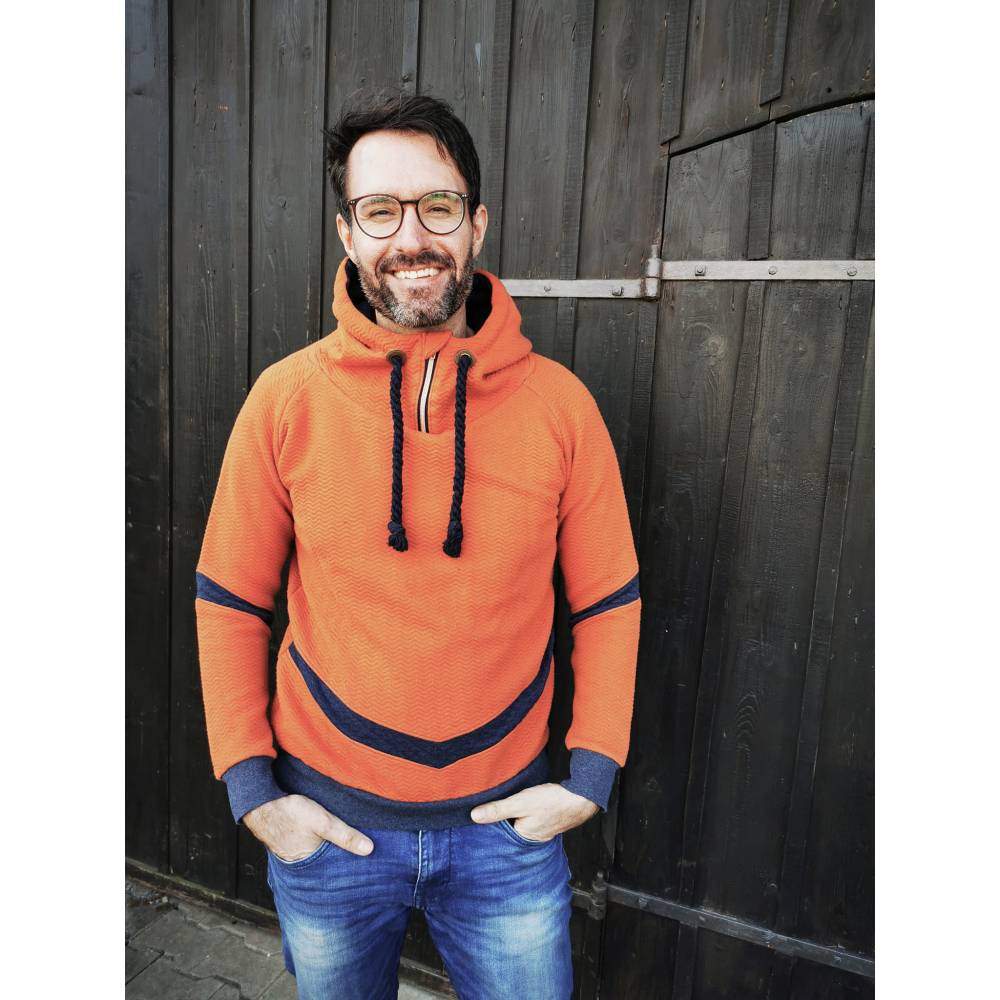 Mit dem Schnittmuster „Hoodie Mr. Jona“ kannst du einen modernen, bequemen und sportlichen Herren-Hoodie nähen. Die markanten Teilungsnähte an Vorderseite und Ärmeln sorgen für eine dynamische Optik und bieten unzählige Möglichkeiten zur individuellen Gestaltung. Das Highlight des Schnitts ist die hohe Kapuze mit Reißverschluss, die nicht nur stylisch aussieht, sondern auch vor Wind und Kälte schützt.