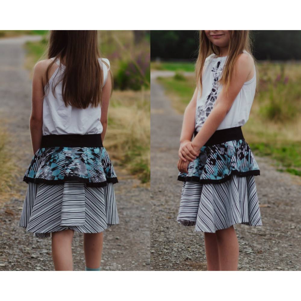 Dieser süße Meerjungfrauenrock ist Teil der Ariella-Serie und bietet dir die Möglichkeit, gleich zwei tolle Rockversionen in ganz unterschiedlichen Looks zu nähen! Das Schnittmuster enthält alle Teile für einen imposanten, längeren Meerjungfrauenrock oder einen süßen Tellerrock im Meerjungfrauenlook. So gibt es für den langen Rock ein schmales Bleistiftrockteil, welches mit insgesamt fünf verschiedenen Volantstufenteilen verbunden werden kann. Für den Tellerrock, werden die gleichen Volantstufen genutzt, sodass sich eine große Zahl an Kombinations- und Umsetzungsmöglichkeiten ergibt. Diese Stufen lassen sich frei und nach Geschmack kombinieren und können sowohl doppellagig als auch einfach genutzt werden. Besonders für den Meerjungfrauenlook geeignet, ist die „Flossystufe“, welche eine Vokuhilavolantstufe ist und der Optik einer Meerjungfrauenflosse entspricht. Auch diese Volantstufe ist mit allen anderen Stufen frei kombinierbar. Beim Bauchabschluss hast du die Wahl zwischen dem enthaltenen Jerseybauchbündchen oder einem normalen Bauchbündchen aus Bündchenware. Egal ob du einen optisch sehr aufwendigen, schicken Rock für besondere Anlässe oder ein verspieltes, alltägliches Tellerröckchen suchst - Ariella macht beides möglich :)!