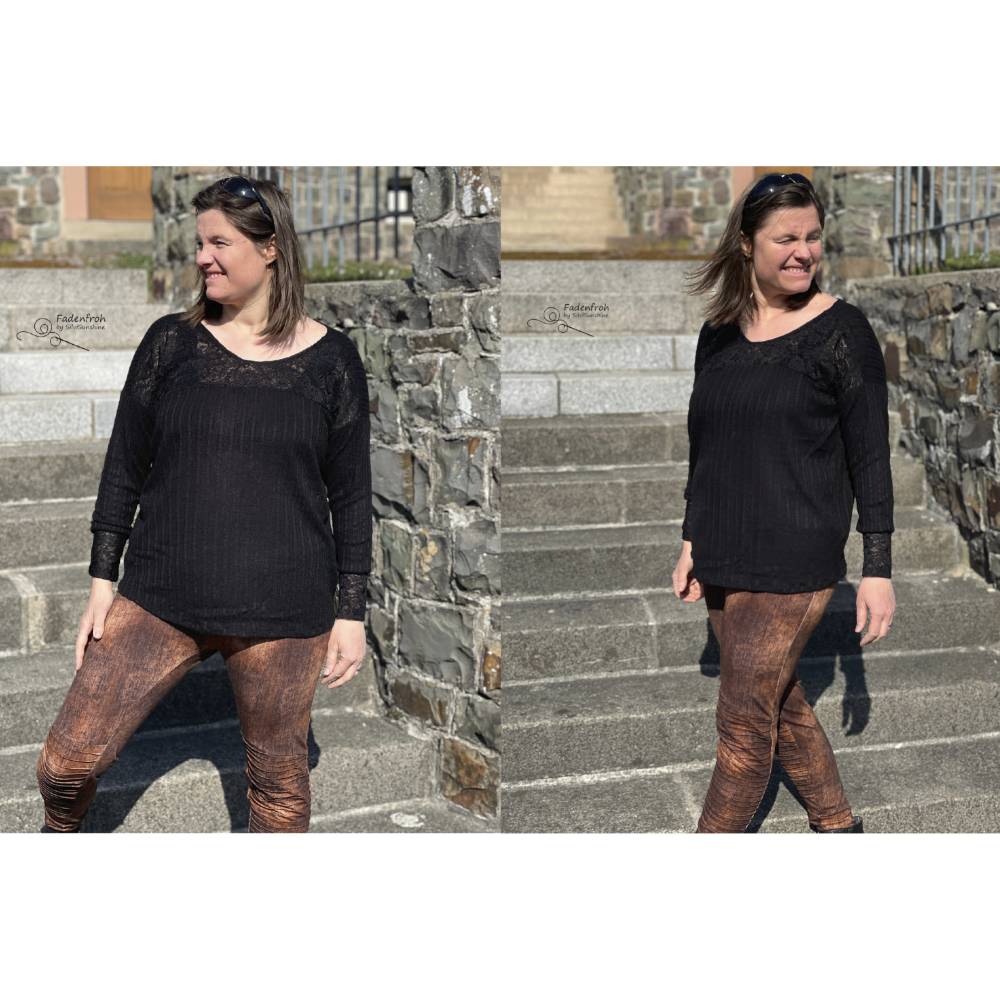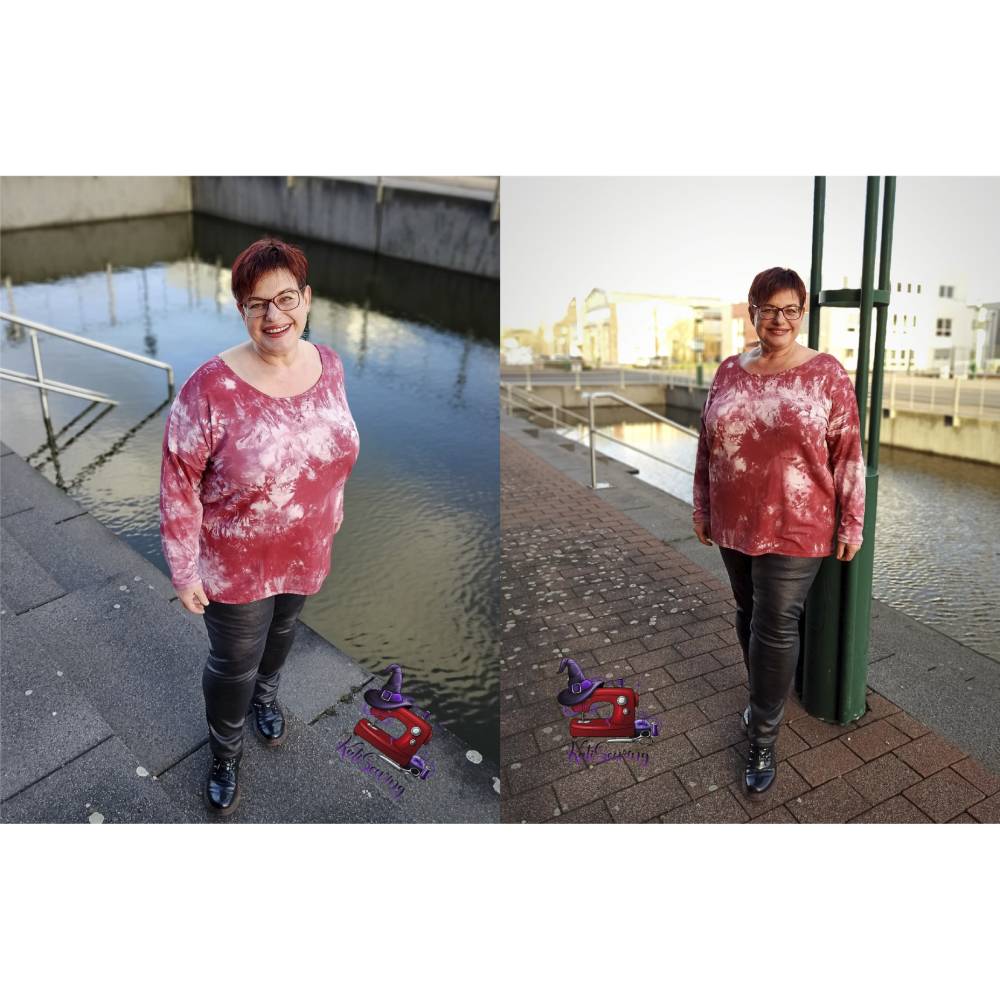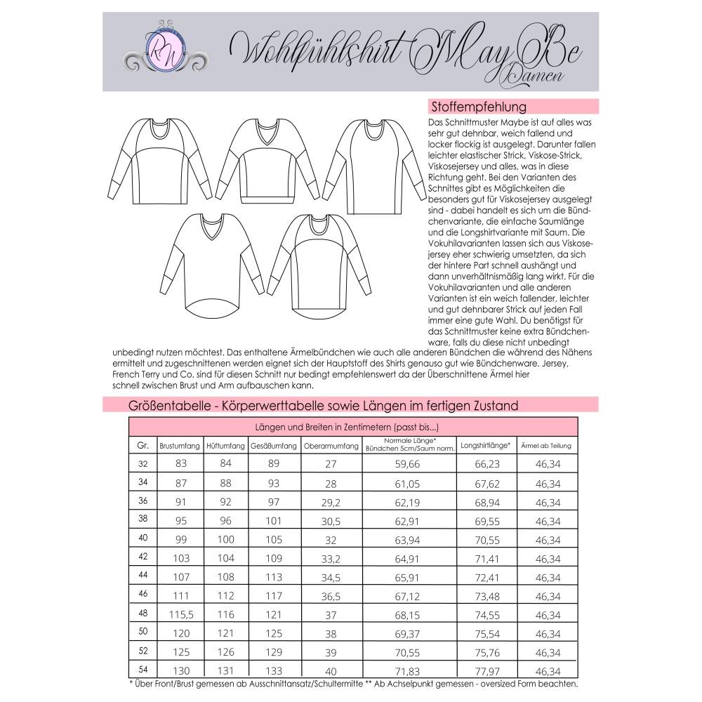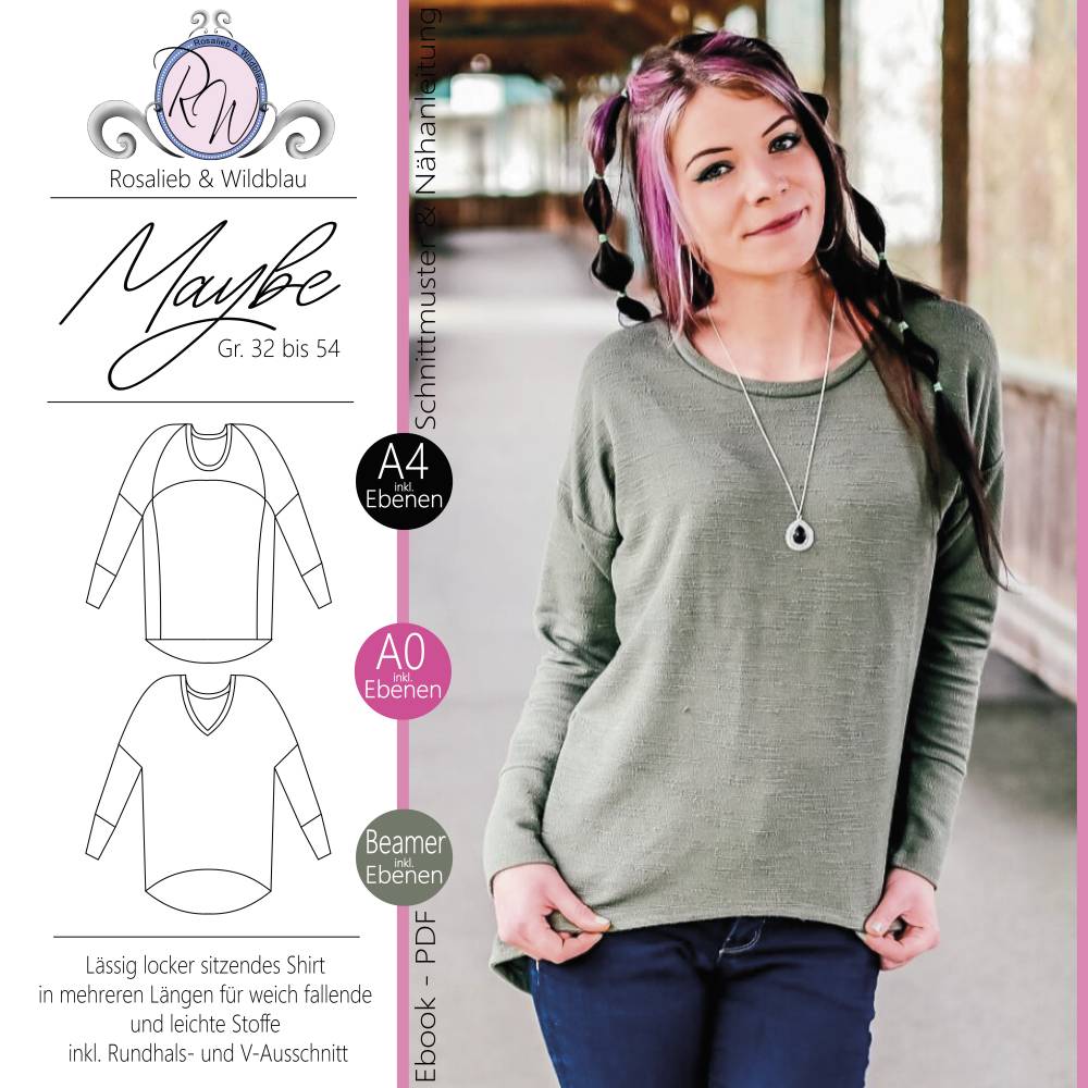 Neben vielen aufwendigen und aufregenden Schnitten sind auch sie absolut wichtig für mich - einfache Wohlfühlteilchen. Sie sind meine heimlichen Alltagshelden, denn einfach schnell übergeworfen und lässig locker, brauche ich sie unbedingt in meinem Kleiderschrank :)! Geht es dir genauso? Dann ist MayBe die richtige Wahl. Es ist nicht nur schnell, sondern auch super einfach genäht und sooo schön locker bequem. Genäht wird das Shirt aus allen Stoffen, die weich fallen, fließen und sich wie eine zweite Haut tragen lassen. Dazu zähle ich vor allem leichten, gut dehnbaren Strick und Viskosejersey. Diese beiden Stoffe eignen sich super zur Umsetzung des Shirts. MayBe bringt dir einen Rundhalsausschnitt, einen V-Ausschnitt, drei Längen und zwei Vokuhilavarianten mit. Und natürlich die Teilungen, die du frei wählen kannst! Bei den Längen handelt es sich um eine Länge für das Anbringen eines Bündchens, eine normale Saumlänge, die auch für ein Longshirt mit Bündchen genutzt werden kann und die Longshirtlänge, welche auf einen Abschlusssaum ausgelegt ist. Neben den Längen hast du die Wahl zwischen einem zweifach gebogenen Vokuhilaabaschluss oder einem vorne etwas länger endenden, leichten Vokuhilabschluss. Hierzu kannst du dir nach dem enthaltenen Tutorial einen Saumbeleg anfertigen.
