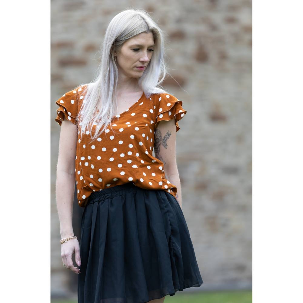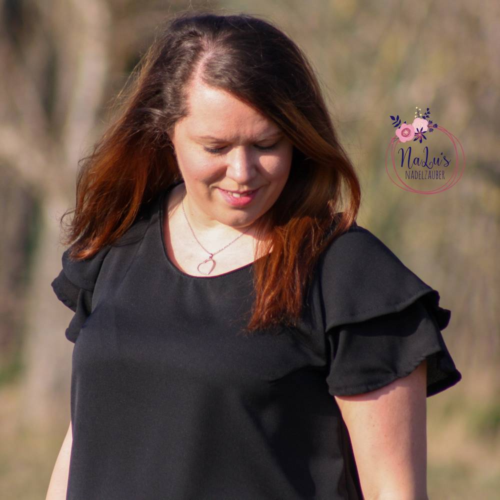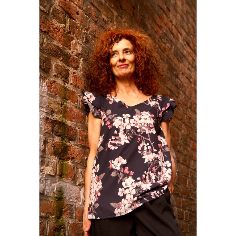 Anouk ist ein auf Webware ausgelegtes, luftig leicht sitzendes Blusenshirt. Etwas tailliert mit V-Ausschnitt, Brustabnähern und Flügelärmelchen lässt sich Anouk am besten aus weich fließendes Stoffen wie Viskose, Chiffon, Satin oder auch Musselin nähen.