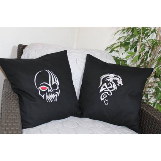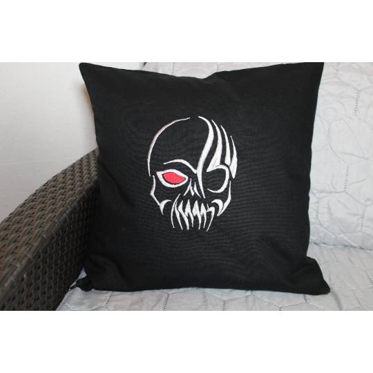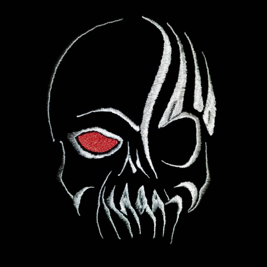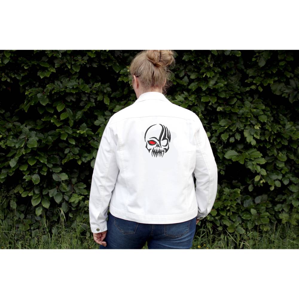 Schönes Schädelmotiv in zwei Farben mit zwei Arbeitsschritten. Referenzdatei PES 18x13cm mit 9.100 Stichen. Effektvoll, in Satinstichen ausgearbeitet lässt sich dieses Muster sehr gut kombinieren. Auf der weißen Jeansjacke kommt Brother Farbe 817 und 800 zum Einsatz. Mustergröße für Rahmen 18x13cm: 12,9x16,6cm.