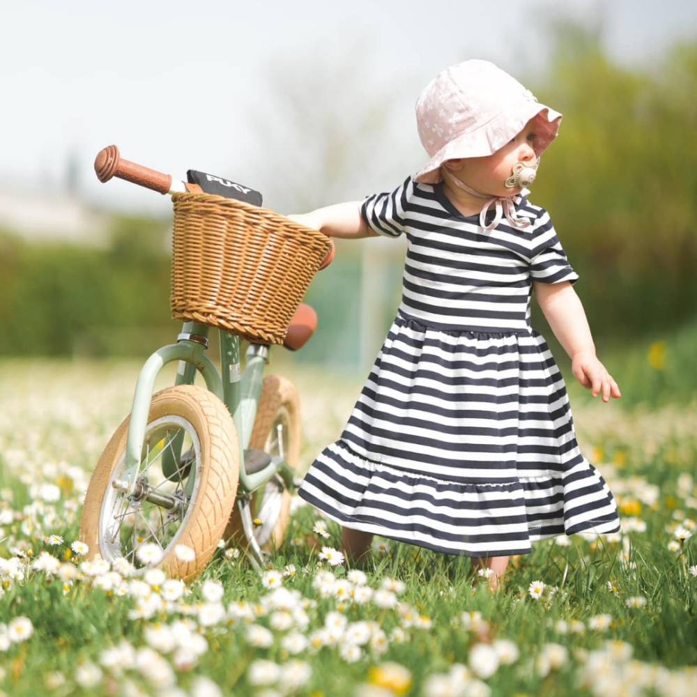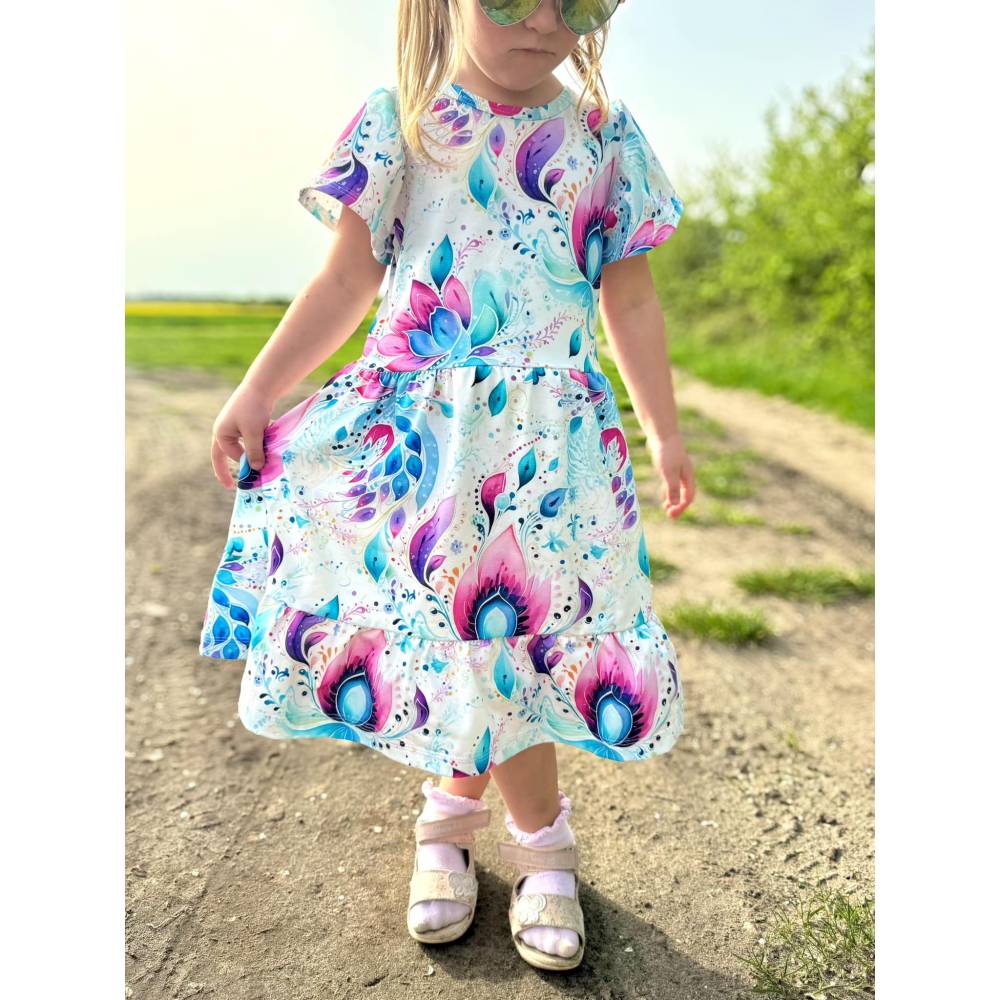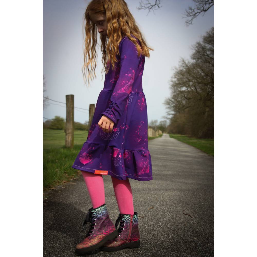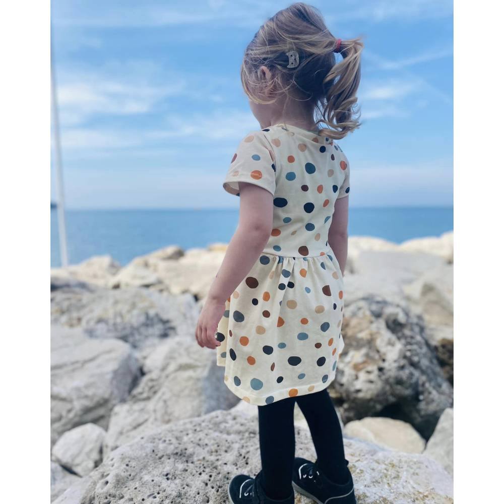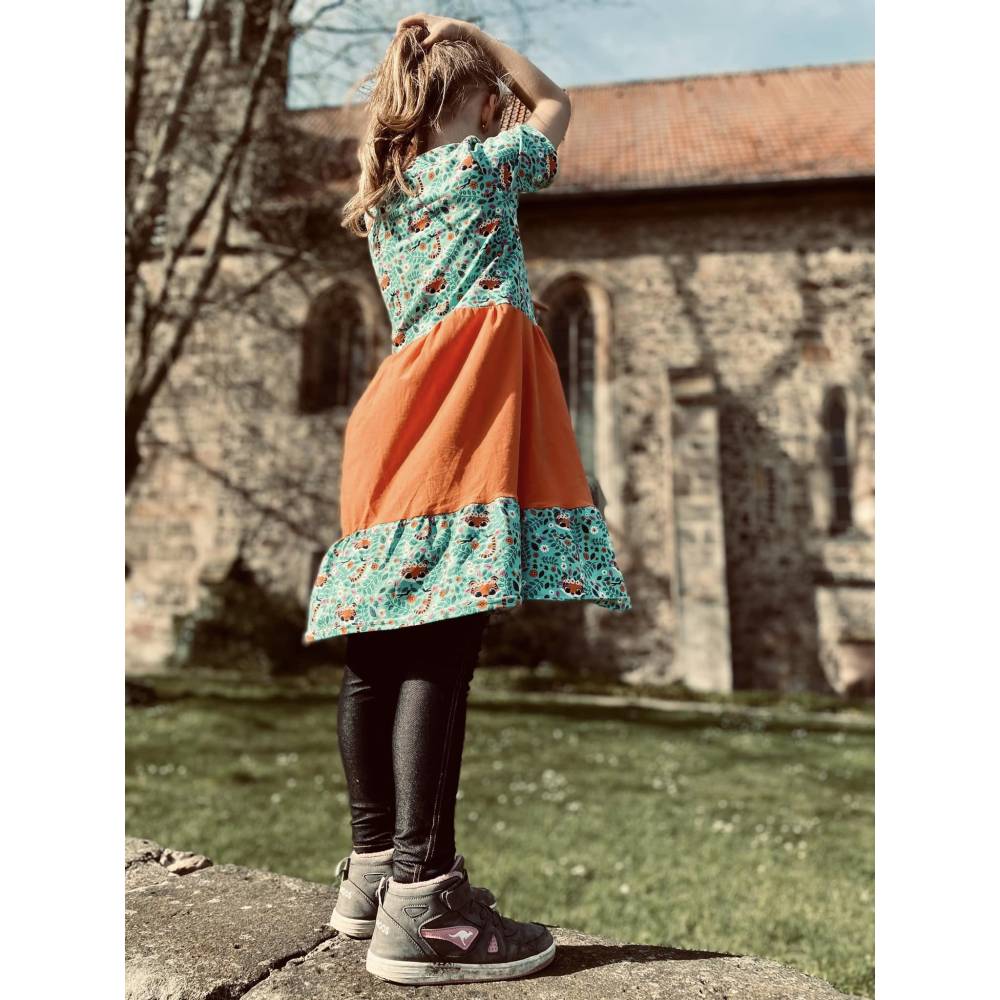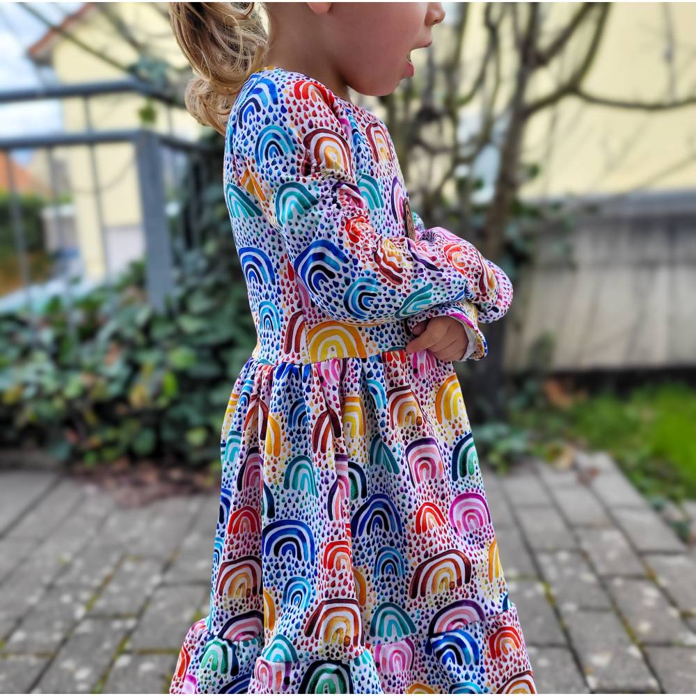 Das Kleid Romance ist ein Schnittmuster für Kinder mit den den Größen 74 bis 158. . Eine Besonderheit bei diesem Kleid sind die gerafften Ärmel und der Volant, den du an zwei verschiedene Rockteile nähen kannst. Einen normalen Rock, der an das Oberteil gekräuselt wird oder einen Tellerrock, der ohne Kräuselung angenäht wird.