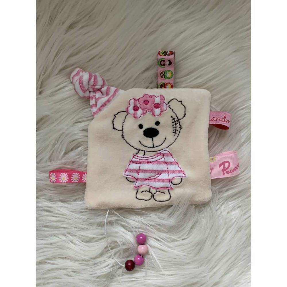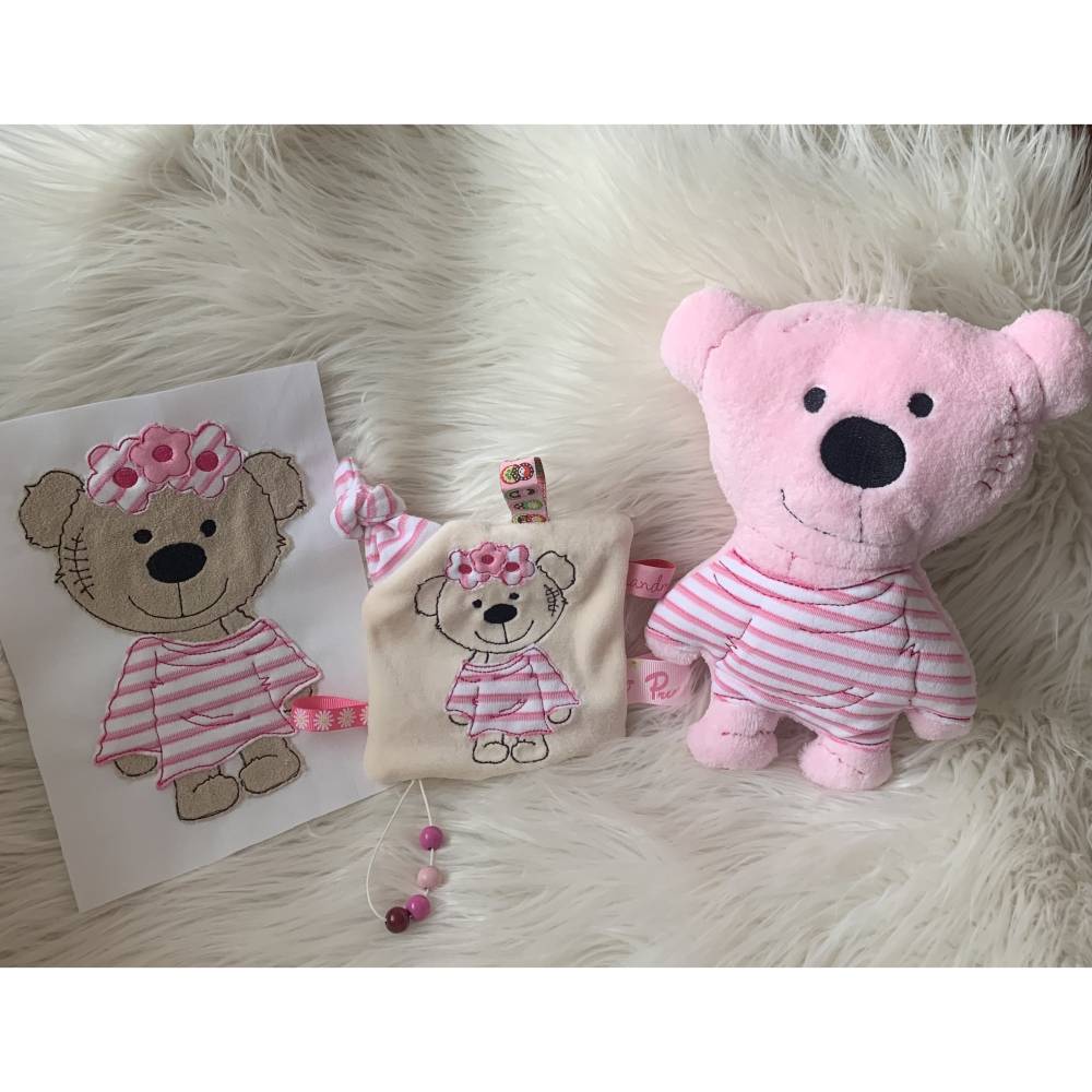 Entdecke die bezaubernde Stickdatei Doodle Teddy Bär Girl als 3-teiliges In the Hoop Set 731 für Deine Stickmaschine! Dieses liebevoll gestaltete Set beinhaltet alles, was Du für süße Babyprojekte brauchst: Ein Doodle Teddy, ein praktisches Schnullertuch mit Knoten und weitere zauberhafte Applikationen.