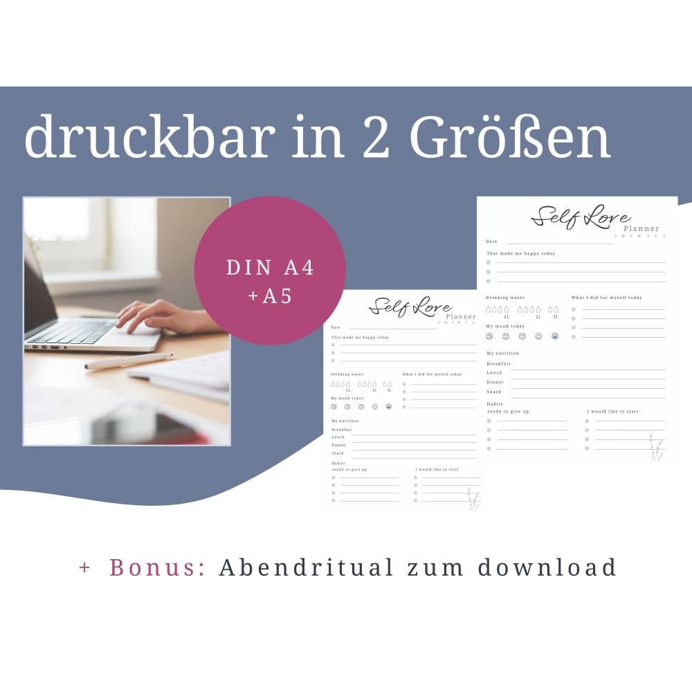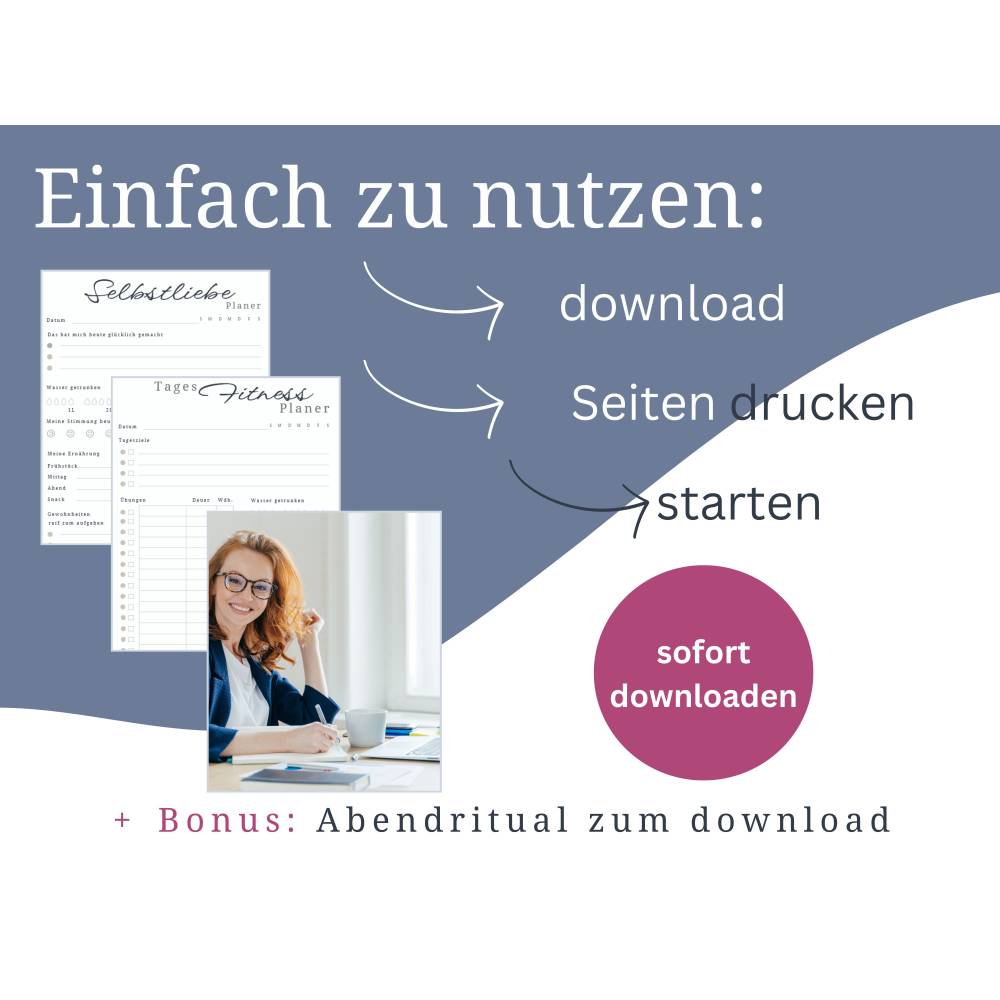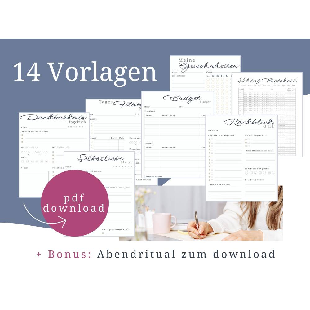 Dieser digitale Planer mit Selbstfürsorge-Übungen ist ein idealer Begleiter für mehr Achtsamkeit und persönliche Weiterentwicklung. Mit 14 verschiedenen Vorlagen bietet dir das Selbstentwicklungs Planer Set zum ausdrucken speziell gestaltete Seiten, die dir helfen können, Stress abzubauen, klare Ziele zu setzen und deine mentale Gesundheit zu stärken. Egal ob du deine tägliche Routine, deine Finanzen und deinen Schlaf verbessern oder gesündere Essgewohnheiten etablieren möchtest – nimm dir etwas Zeit für dich selbst, entdecke neue Wege zu mehr Gelassenheit und schaffe Raum für positive Veränderungen.