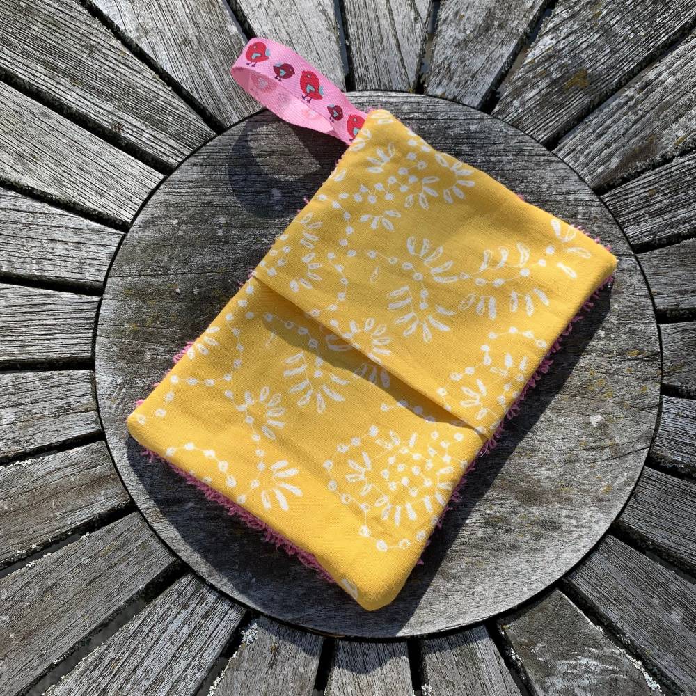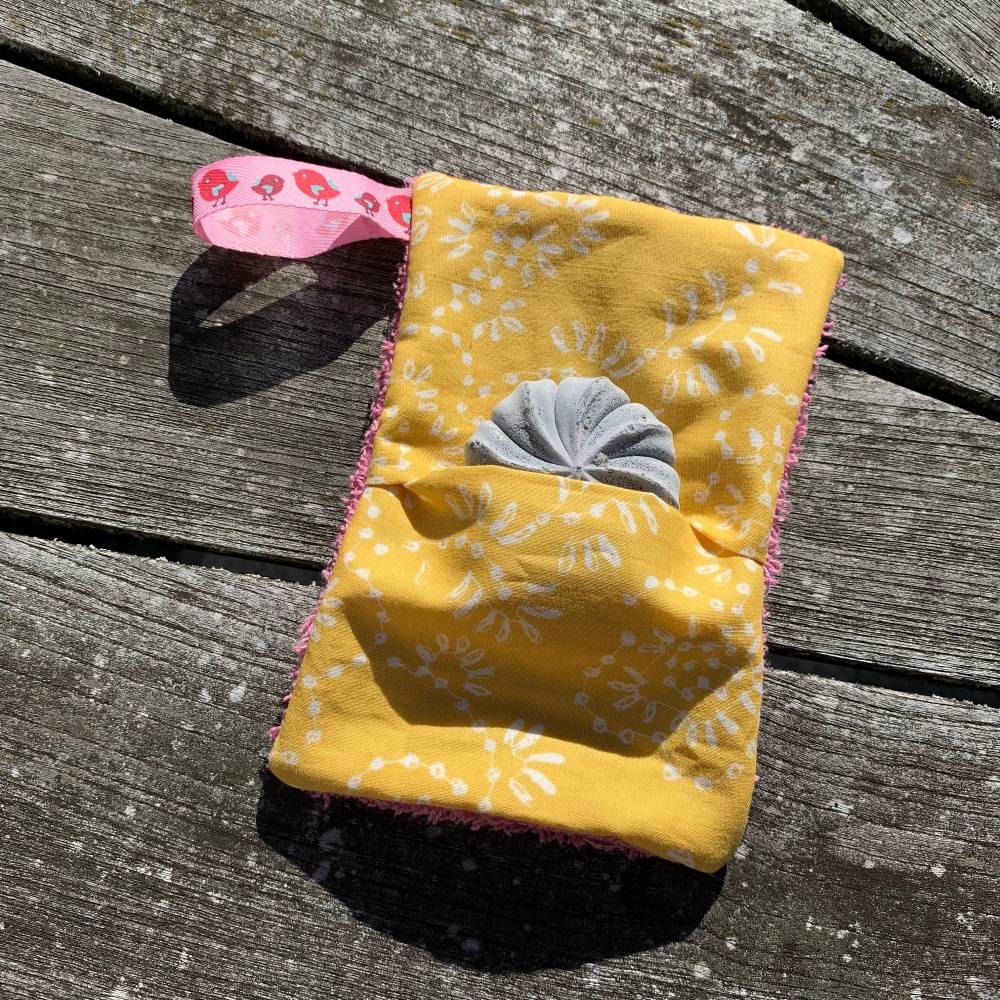 Der Waschlappen hat am Ende eine Breite von 11 cm und eine Länge von 16 cm.