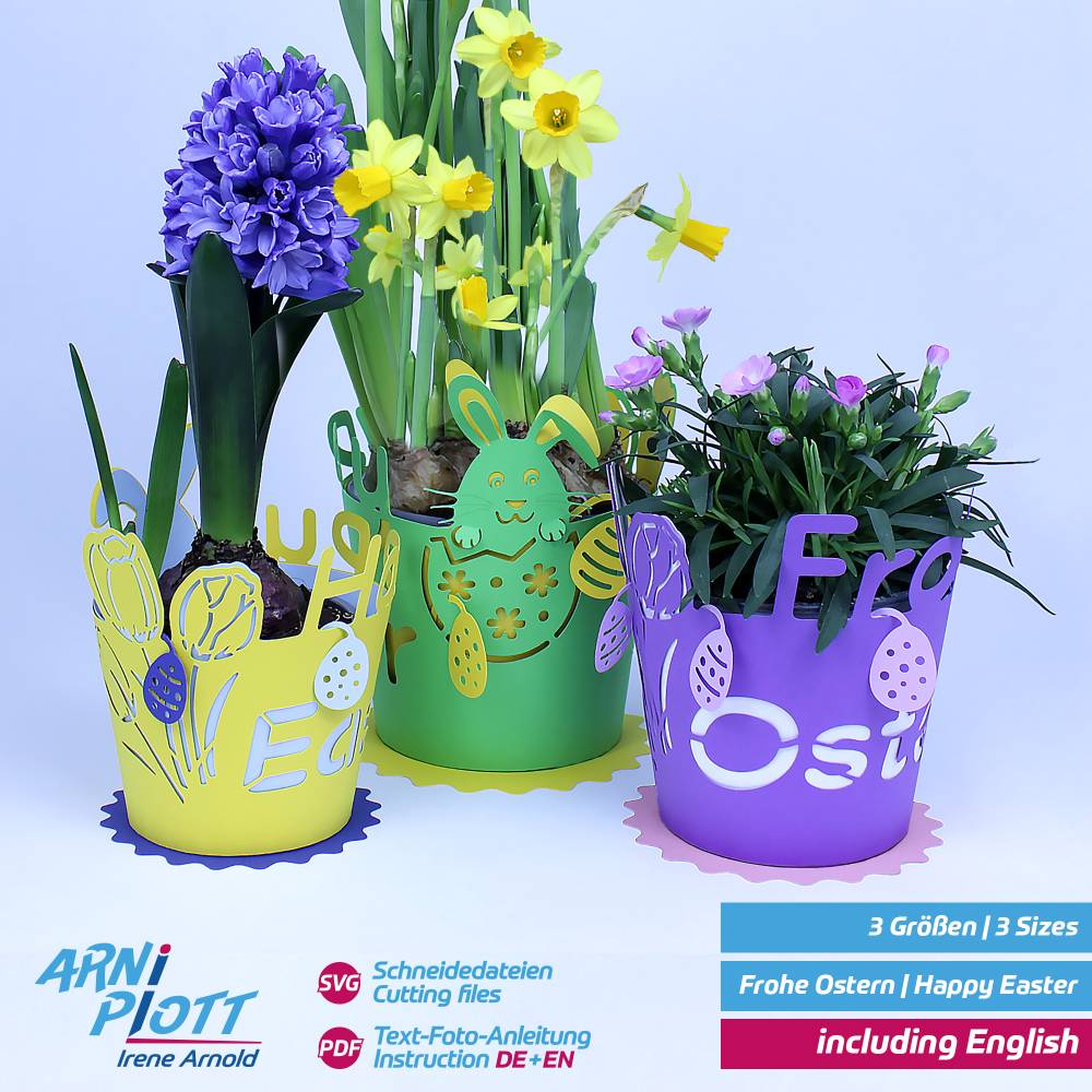 3 Topfgrößen (siehe Foto) vorbereitet, die du selbstverständlich auch noch skalieren kannst. Jede Größe mit dem Schriftzug „Frohe Ostern“ und auch „Happy Easter“.