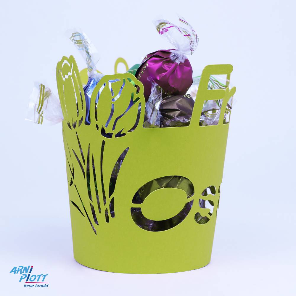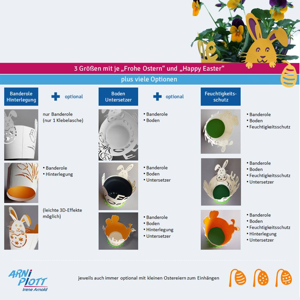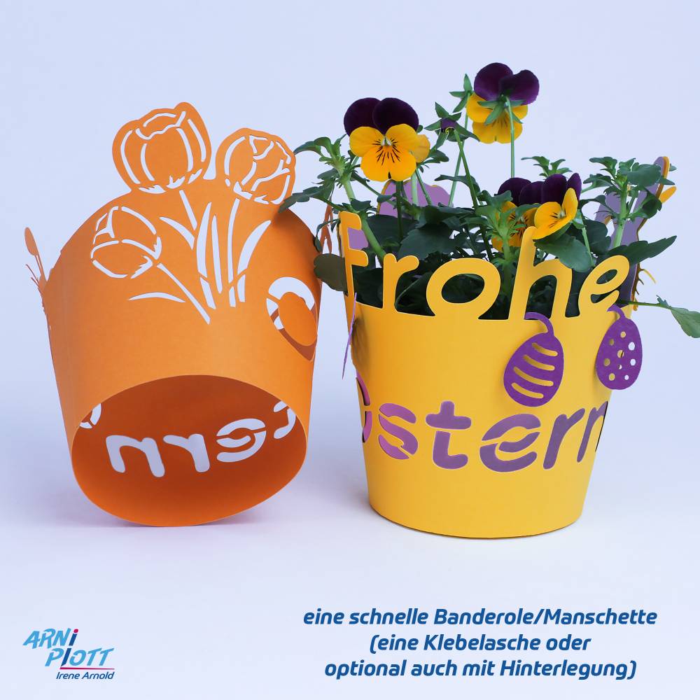 vielseitige Einsatzmöglichkeiten: von der einfachen, schnellen Banderole für Oster Blumen bis zum Übertopf für Echtblumen mit Feuchtigkeitsschutz und Untersetzer oder der Topf verwandelt sich in ein Osternest, eine Geschenkschachtel für Süßes.