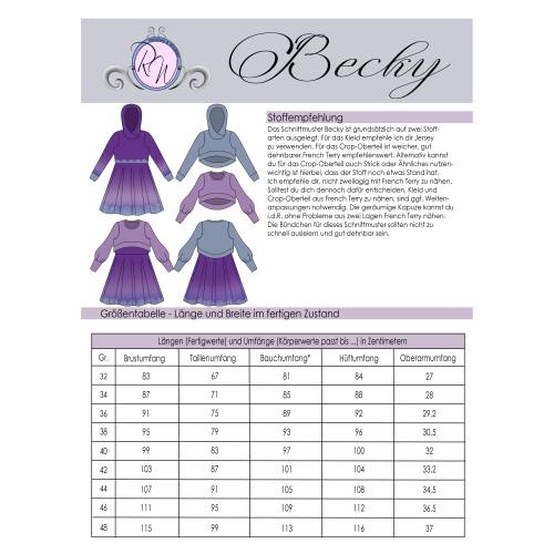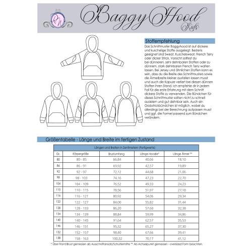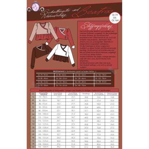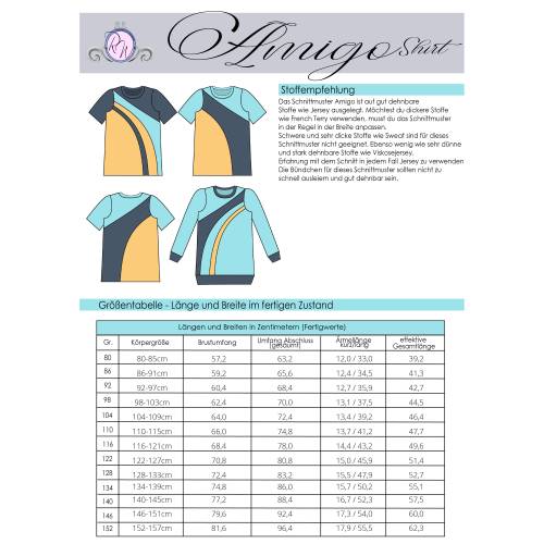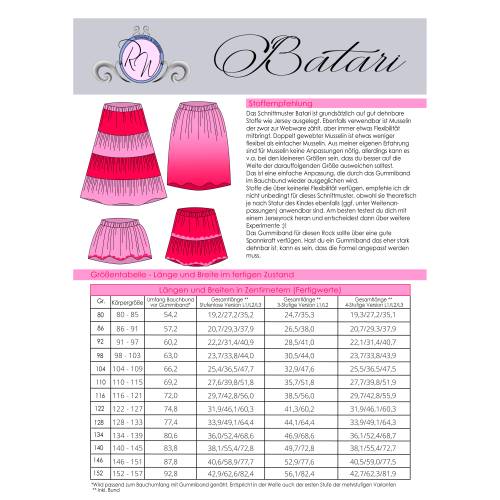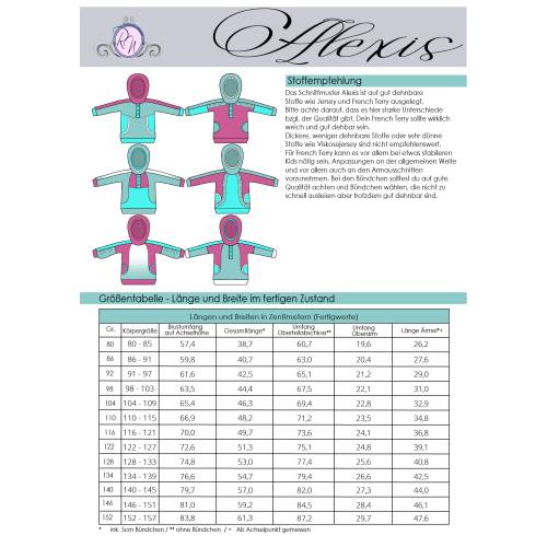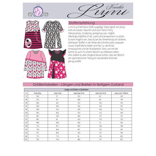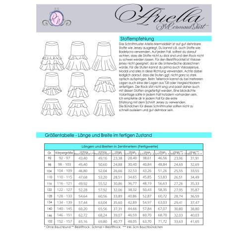 Das Schnittmuster ist in Echtgröße (du nähst hier nach echter Körpergröße) gradiert und enthält keine Naht- und Saumzugabe. Es umfasst die Größen 80 bis 152 und ist damit für eine Körpergröße zwischen 80 und 157cm geeignet. In den Dateien findest du die A4-Versionen zum Ausdrucken, eine Großdruck-Datei sowie die Beamerdatei - alle Versionen inkl. Ebenen zum Ein- und Ausblenden der Größen. Bellflower ist auf Jersey und weichen, gut dehnbaren French Terry ausgelegt (ggf. mit Anpassungen).