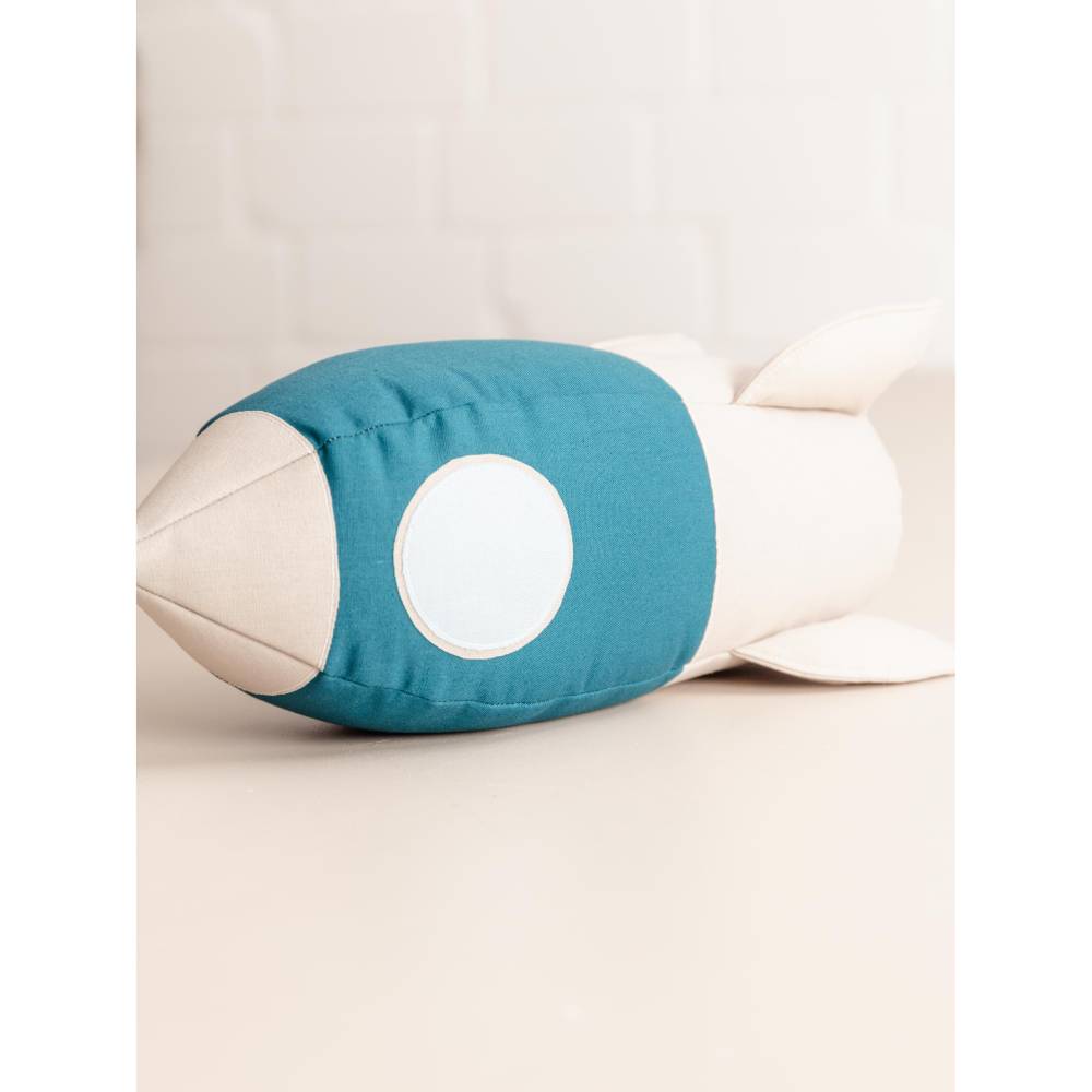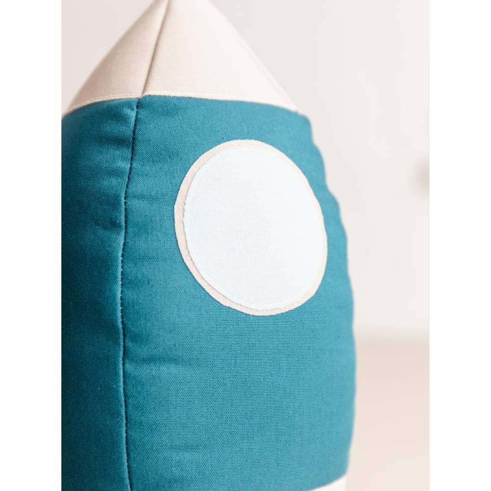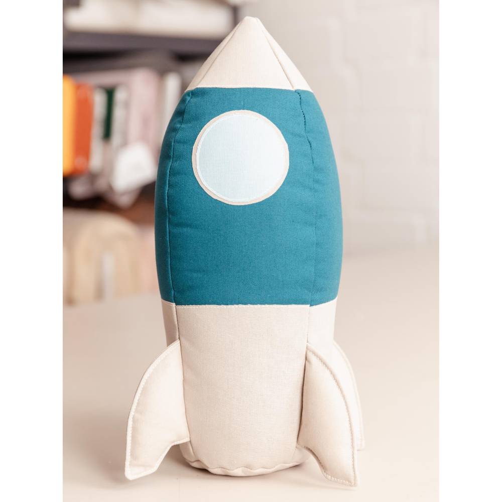 Die Details der Rakete kannst du wunderbar mit Applikationen umsetzen. Du kannst deiner Kreativität freien Lauf lassen, indem du gestickte Bügelaufnäher, nachtleuchtendes Garn oder sogar leuchtende Farbe verwendest. Die Rakete kann dank ihrer stabilen Konstruktion eigenständig stehen – das war mir besonders wichtig, denn so kann sie nicht nur zum Spielen, sondern auch als dekoratives Kissen verwendet werden.