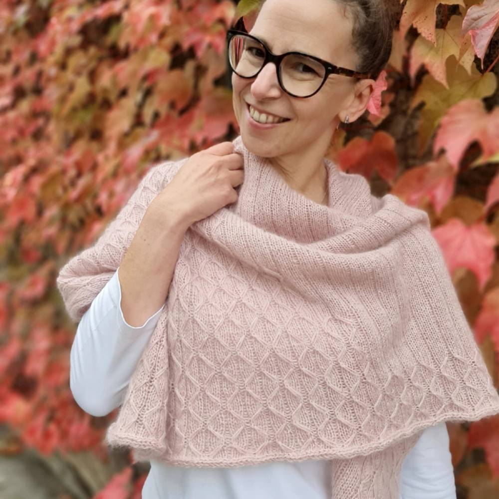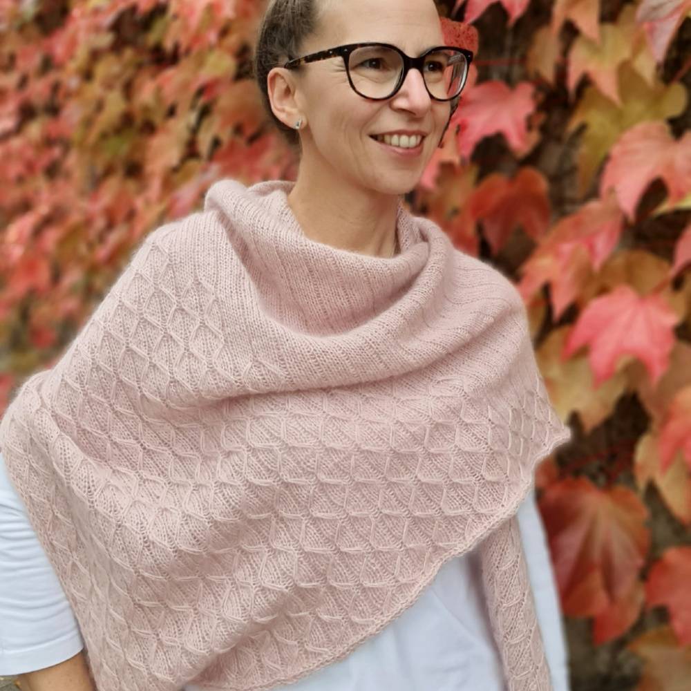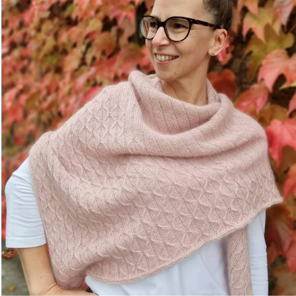 Das Besondere an diesem Tuch ist die Kombination von zwei Garnen, die hier zusammen verstrickt werden. Hier lässt sich wundervoll mit Farben spielen, je nachdem welche Nuancen miteinander kombiniert werden. Das Muster ist eingängig und verspricht Strickspass.