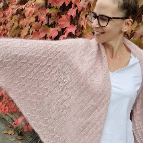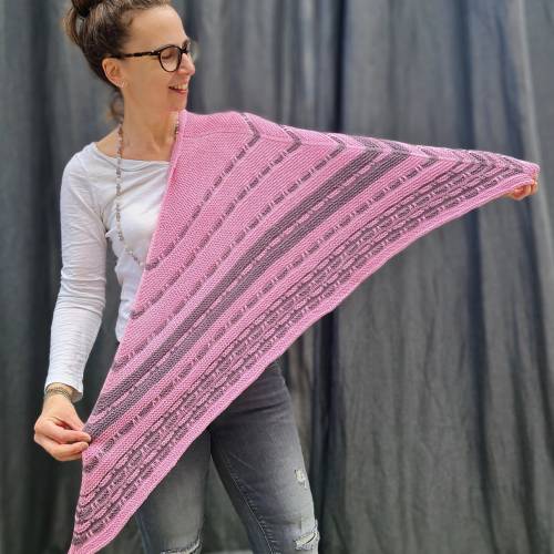 Das Tuch KAHA wird von der Spitze aus gestrickt und durch Zunahmen in Hin- und Rückreihen geformt. Die regelmäßigen Farbwechsel verleihen dem Tuch seinen charakteristischen Streifen-Look, während die abschließende Rüschenborte ihm einen romantischen Touch verleiht.