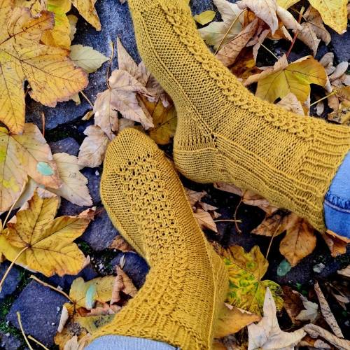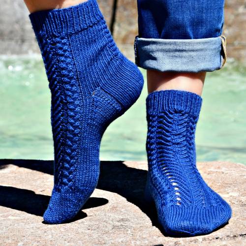 Der doppelte Rollrand verleiht den Socken eine verspielte Note, während das filigrane Lace-Muster mit seinem kleinen, zarten Lochmuster an tanzende Schmetterlinge erinnert. Einfach zu stricken, aber mit großartiger Wirkung. Perfekt für Stricker*innen, die ein besonderes, aber dennoch entspannendes Projekt suchen.