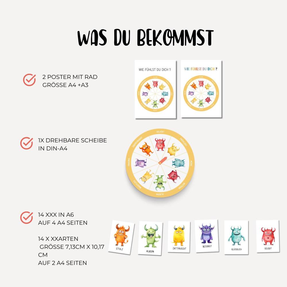 Gefühlskarten Monster für Kinder, Gefühlsrad Montessori, Lernkarten Emotionskarten zum downloaden