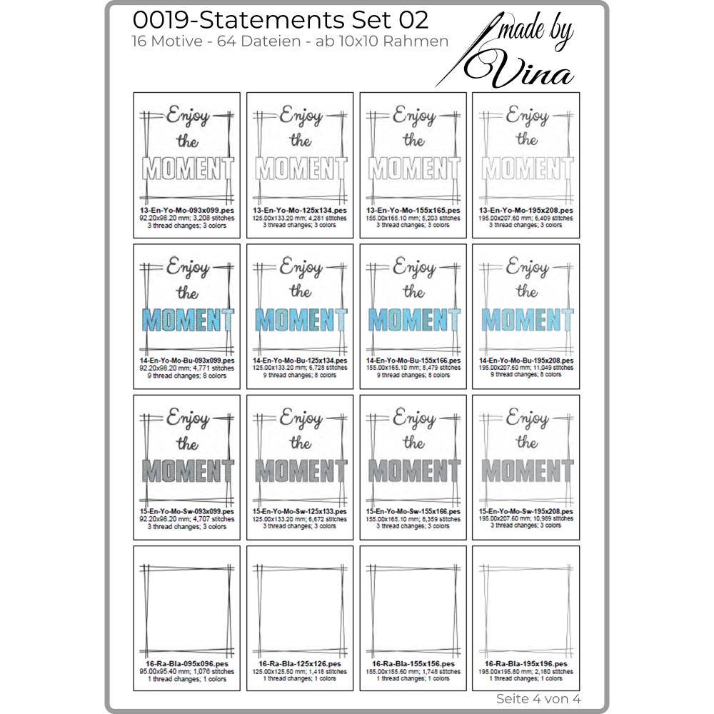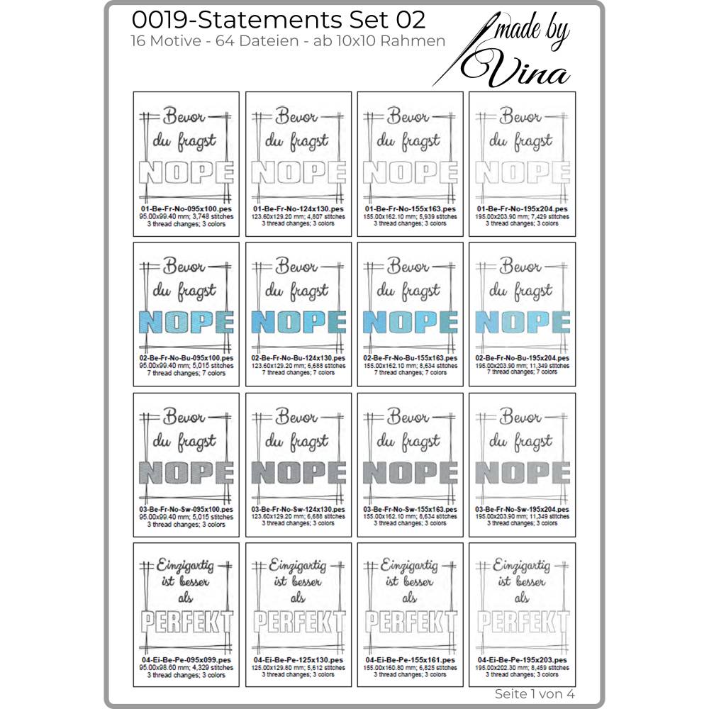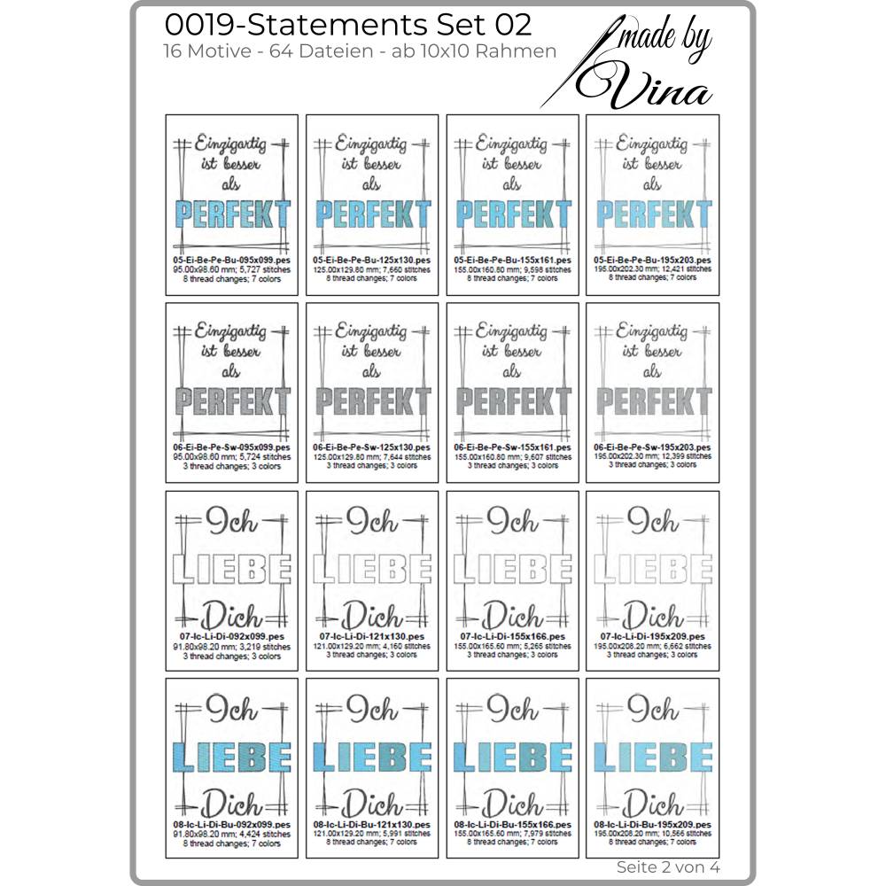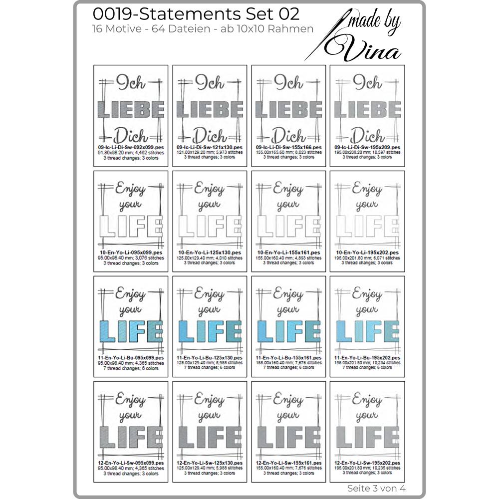 Von witzig bis tiefgründig – mit diesem Set findest du garantiert das passende Statement für dein nächstes Stickprojekt. Die vollständigen Übersichten aller enthaltenen Dateien siehst du in den Produktbildern.