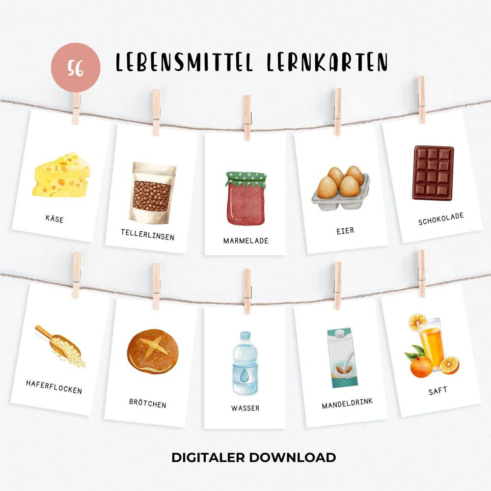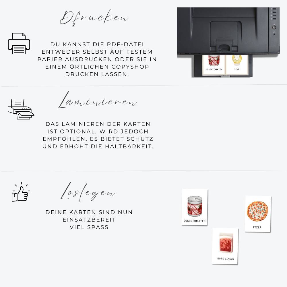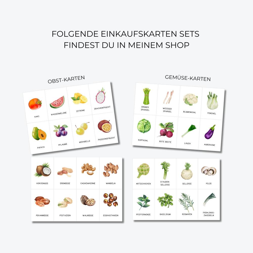Nutze sie für verschiedene Lernspiele wie Memory, Lebensmittelerkennung oder bei der Planung der Einkaufsliste und beim Einkaufen. Diese Karten dienen als hervorragende Hilfsmittel, um den Wortschatz zu erweitern und erste Leseversuche zu unterstützen. Sie eignen sich auch ideal als interaktive Einkaufskarten, die den Supermarktbesuch zu einem spannenden Abenteuer machen. Fördere die Selbstständigkeit deines Kindes, indem du ihm einen eigenen kleinen Einkaufswagen gibst und es eigenständig die abgebildeten Lebensmittel finden lässt.
