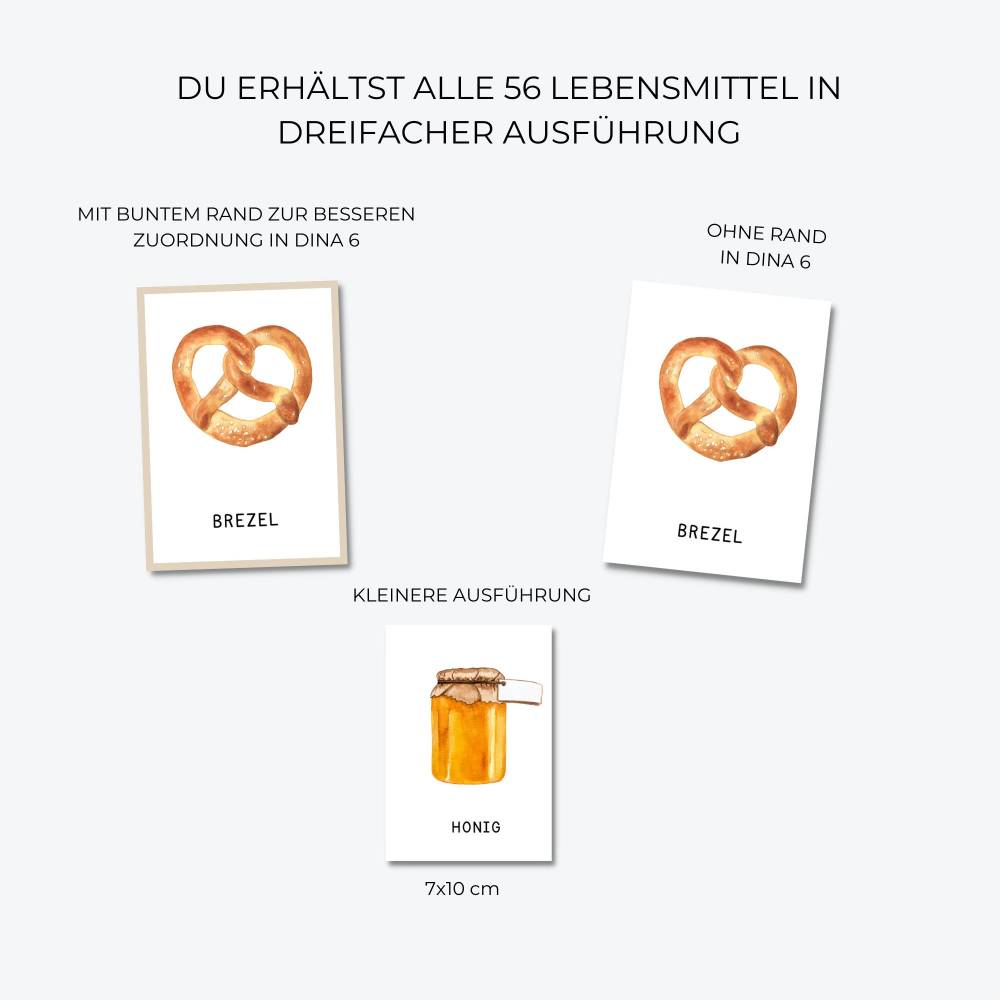 56 Lebensmittelkarten im A6-Format mit buntem Rand zur besseren Zuordnung der Kategorien.