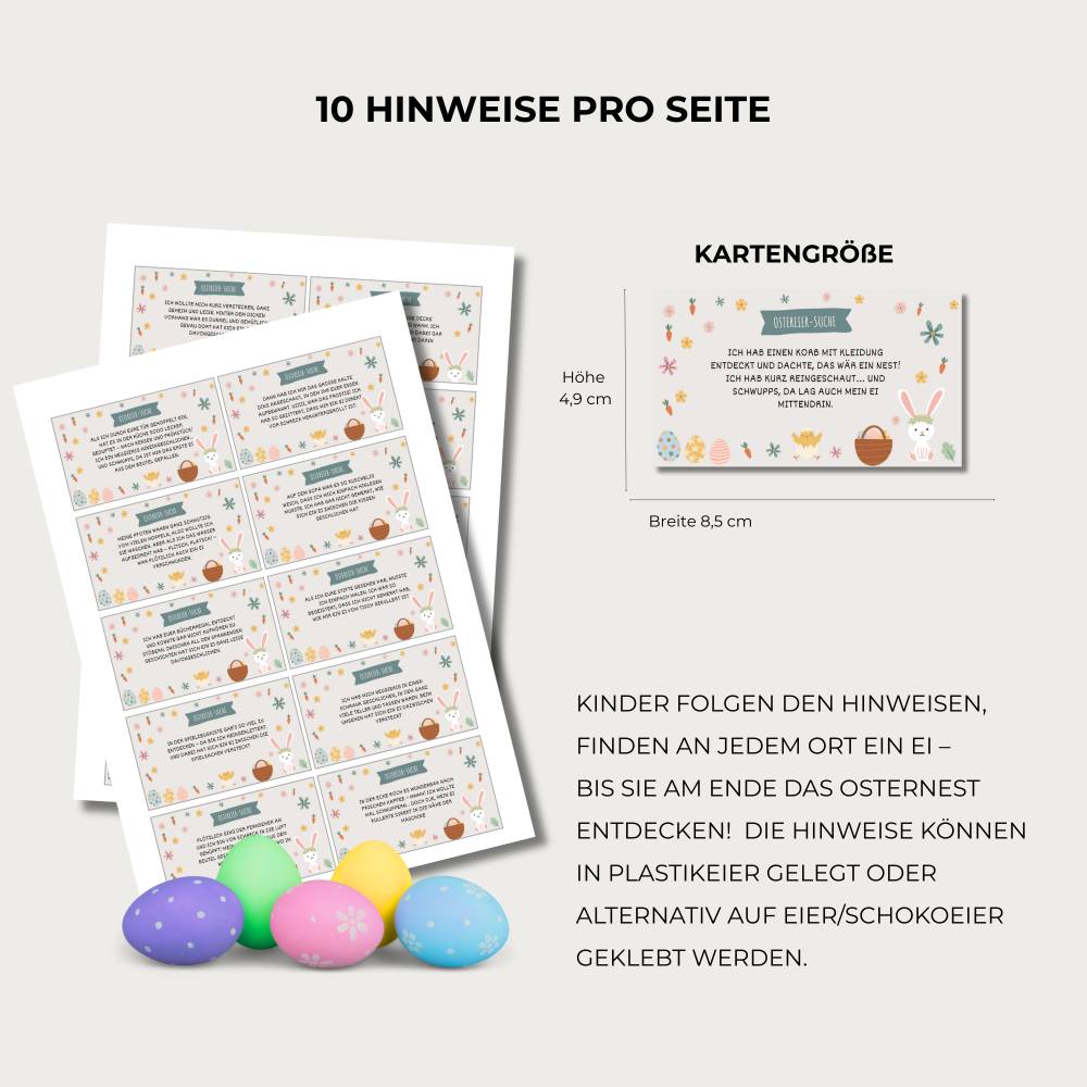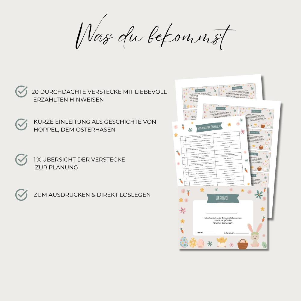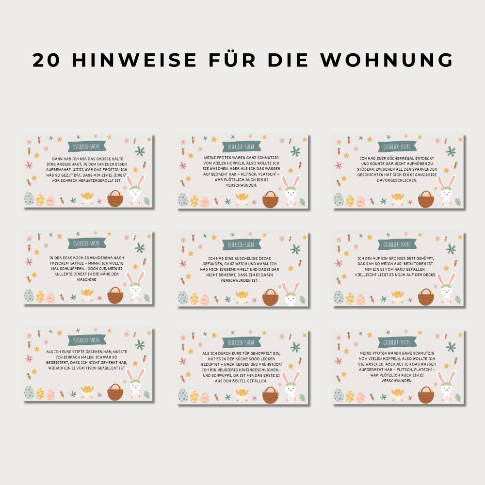 Unsere Indoor-Ostereier Suche ist perfekt, um die klassische Osternestsuche spannender und fantasievoller zu gestalten. Mit 20 kindgerechten Hinweiskarten im Erzählstil wird das Suchen zum Abenteuer – die Kinder folgen den Spuren von Hoppel, dem Osterhasen, durch die Wohnung und entdecken Stück für Stück die verlorenen Ostereier.