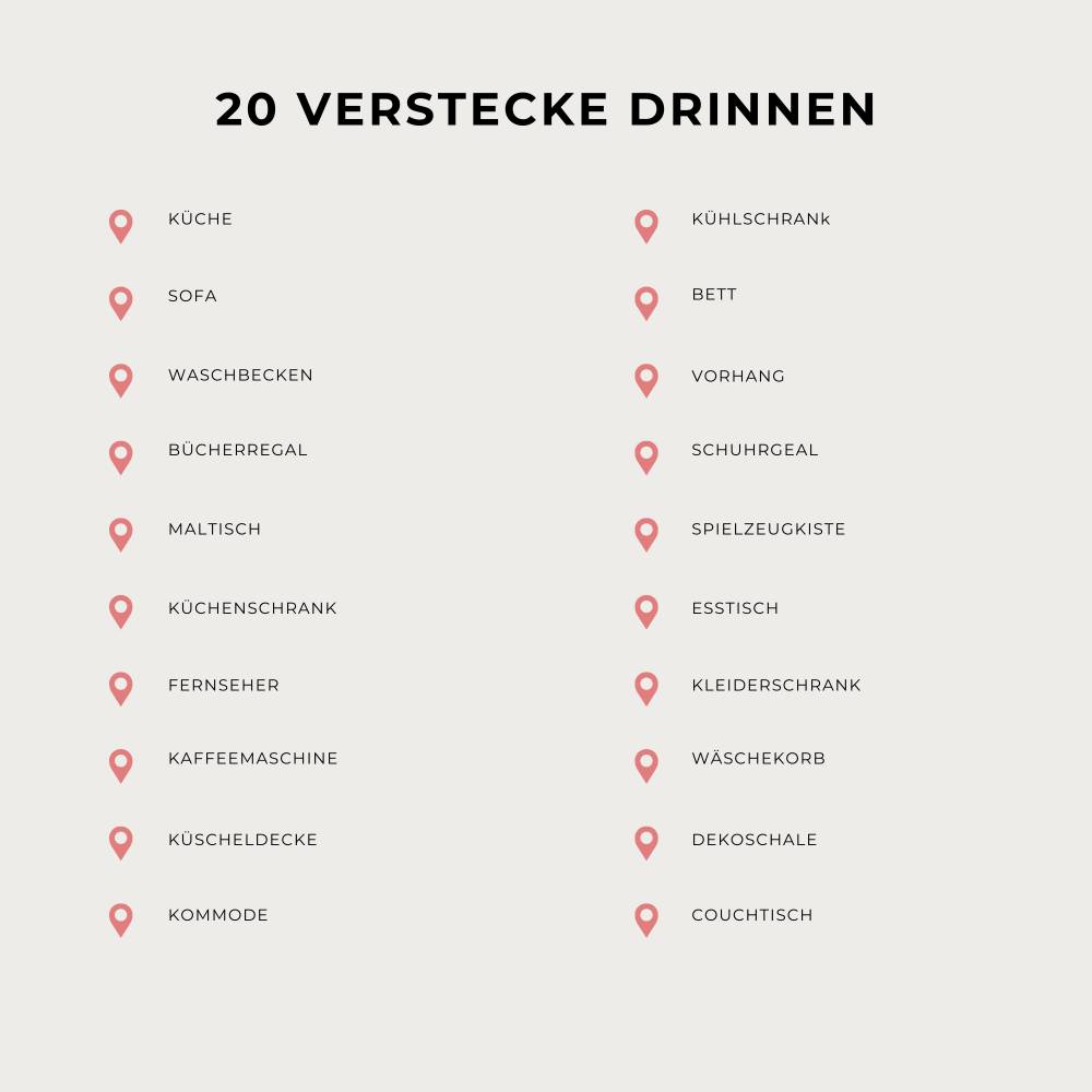 PDF herunterladen, Karten ausdrucken, ausschneiden und an den passenden Stellen in der Wohnung verstecken – schon kann das große Suchen beginnen!