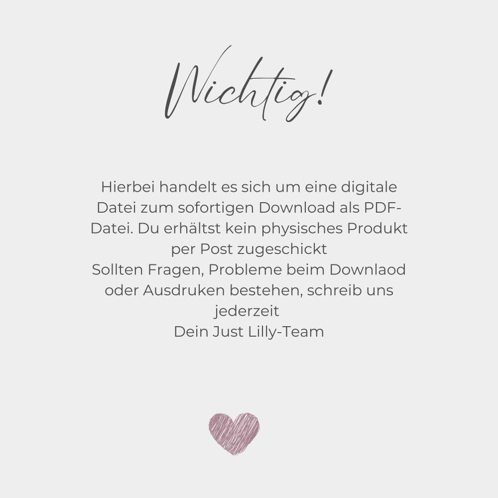 Deine Dateien sind nur wenige Minuten von dir entfernt. Sobald du deinen Kauf abgeschlossen hast, kannst du alle Dateien sofort herunterladen und drucken. Bitte beachte, dass es sich um ein digitales Produkt handelt und daher keine physischen Artikel verschickt werden.