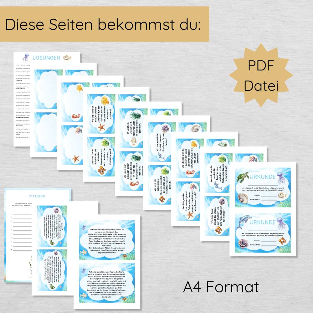 Tauche gemeinsam mit deinen Kindern in die magische Welt der Ozeane ein! Diese fantasievolle Indoor Schatzsuche verwandelt eure Wohnung in eine farbenfrohe Unterwasserwelt. Kleine Entdecker folgen 20 spannenden Hinweisen durch verschiedene Räume und finden am Ende einen geheimen Schatz.