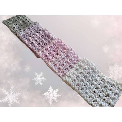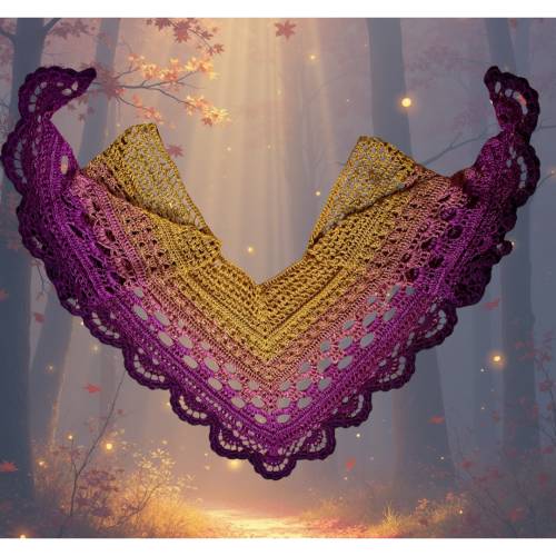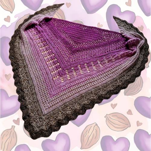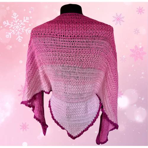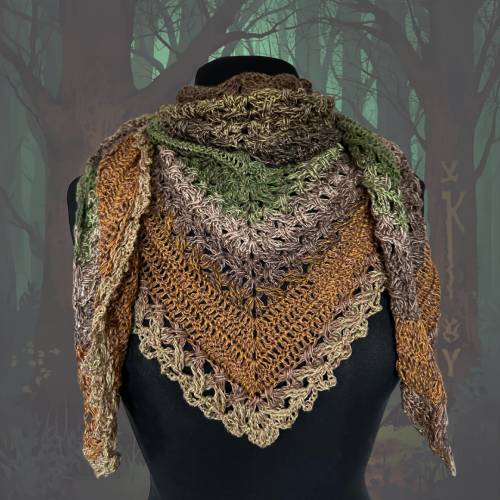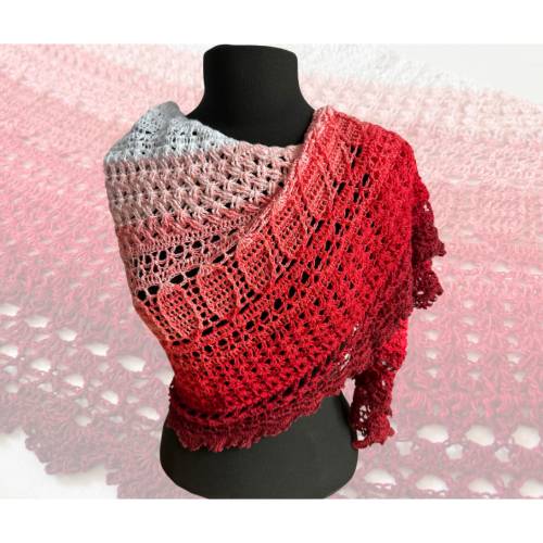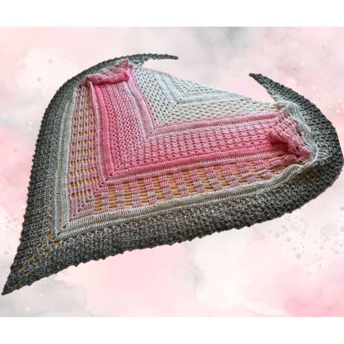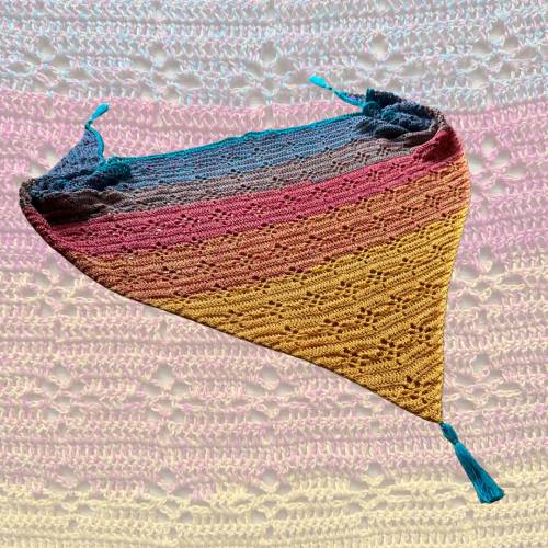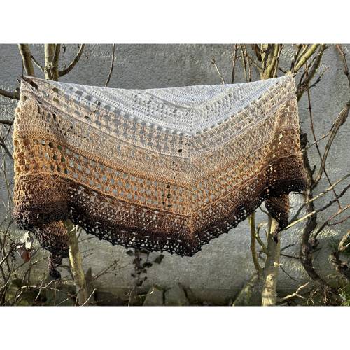 Das gezeigte Tuch wurde aus einem 3-fädigen Bobbel/ 1.000m mit Nadelstärke 3,5 gehäkelt und misst ca. 1,70m in der Spannweite sowie 0,50m an der tiefsten Stelle. Möchtest du dein Tuch größer häkeln? Kein Problem – Tipps zur Erweiterung findest du in der Anleitung!