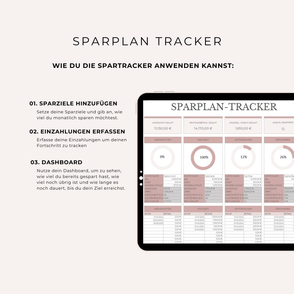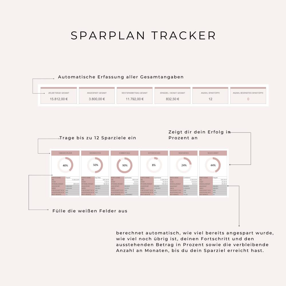 Die Tabelle enthält nur die wesentlichen Elemente, die du benötigst, und ist einfach, leicht verständlich und dennoch optisch ansprechend gestaltet. Alles, was du tun musst, ist deine Spartopf-Informationen einzugeben und zu beobachten, wie die Tabelle automatisch alle Berechnungen für dich durchführt!