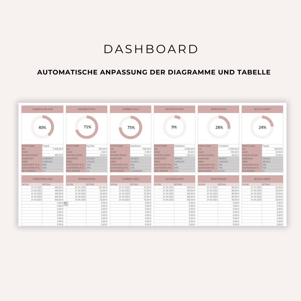 Erhalte einen genauen Überblick darüber, wie viel du bereits in jeden Spartopf angespart hast und erfahre, wie viel du noch beiseitelegen musst! Mit dieser Tabelle hast du die Möglichkeit, für bis zu 12 verschiedene Sparziele zu sparen. Du kannst das Tabellenblatt beliebig kopieren und somit auf weitere Sparziele hinzu sparen.