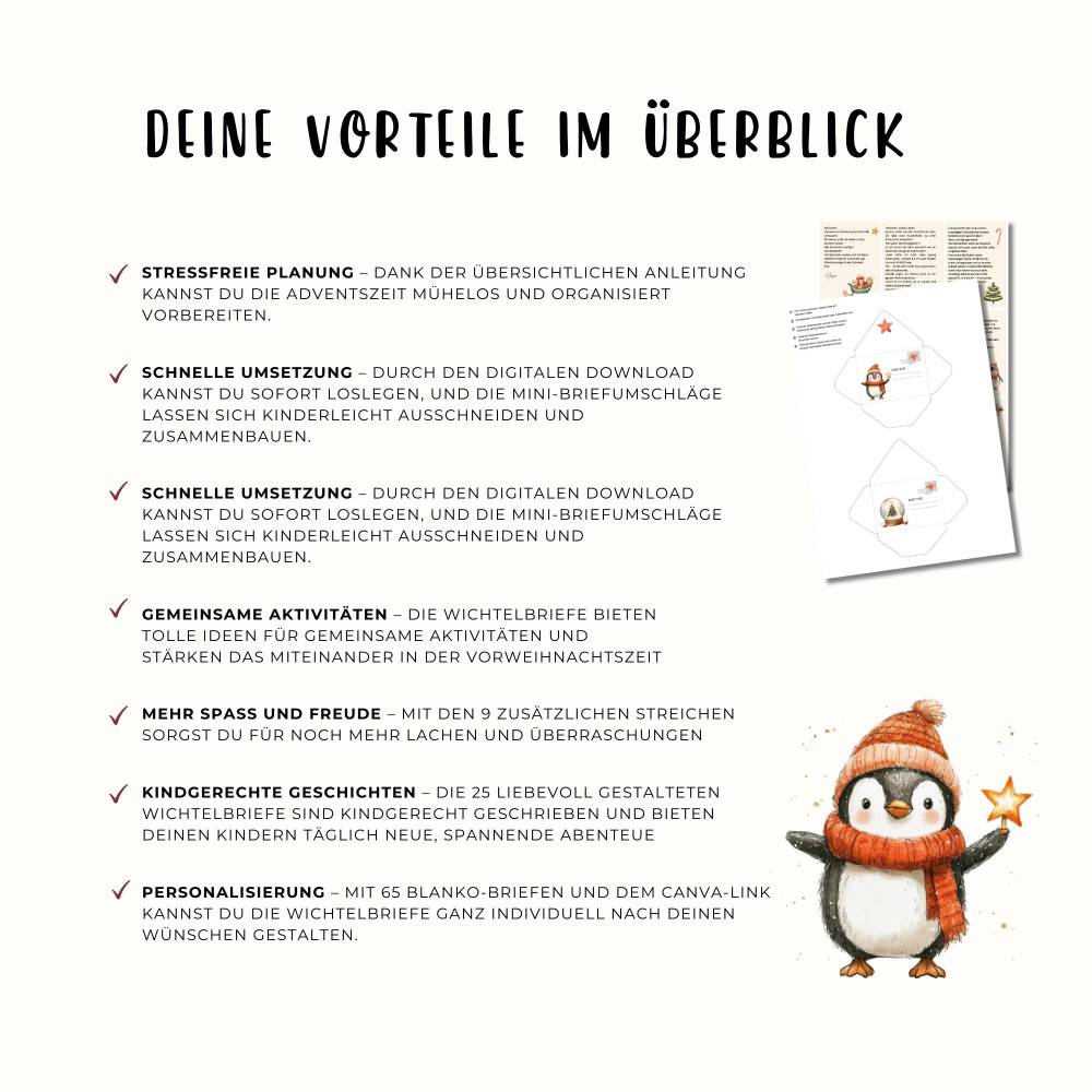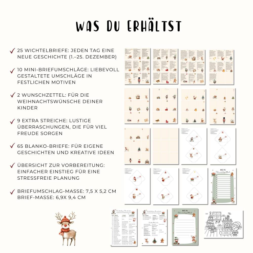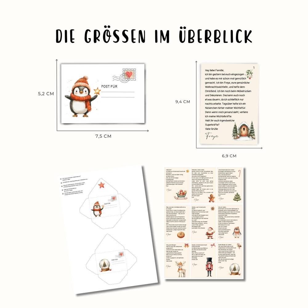 Bereite deine Kinder auf eine unvergessliche Weihnachtszeit vor mit unserem liebevoll gestalteten Wichtelbriefe-Set! Dieses Set enthält 25 zauberhafte Briefe, die deine Kinder vom 1. bis zum 25. Dezember begleiten. Jeder Brief erzählt eine neue, spannende Geschichte aus dem Leben der Wichtelin Freya und sorgt täglich für magische Momente. Zusätzlich gibt es 9 extra Streiche, die für noch mehr Spaß und Überraschungen sorgen.