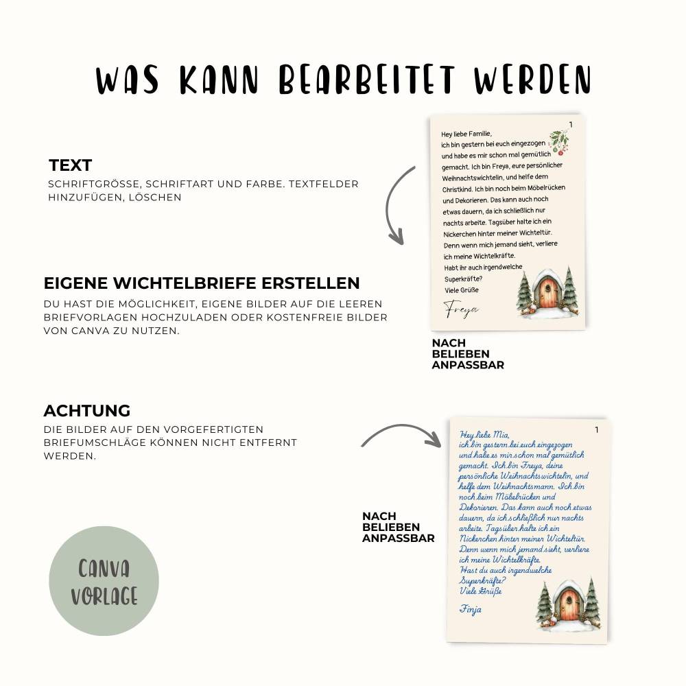 Mit unserem Set erhältst du 90 liebevoll gestaltete Vorlagen, die ideal für Kinder sind. Die Mini-Briefumschläge können kinderleicht ausgeschnitten, gefaltet und geklebt werden. Darüber hinaus kannst du die Briefe über Canva individuell personalisieren und die Vorweihnachtszeit noch persönlicher gestalten.
