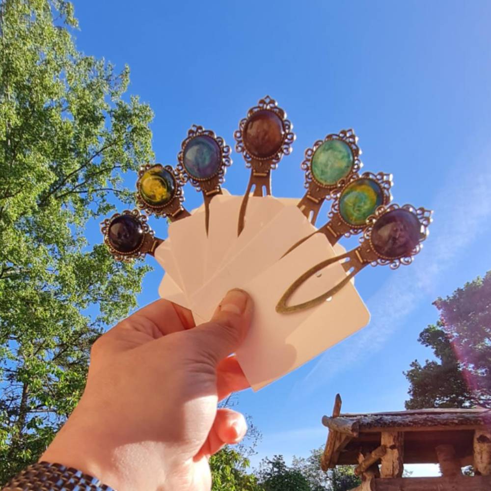 Die Lesezeichen mit Metallklammer und einem dekorativen Cabochon aus Epoxidharz wurde liebevoll von Hand gearbeitet – ein stilvolles und praktisches Accessoire für Bücherwürmer.