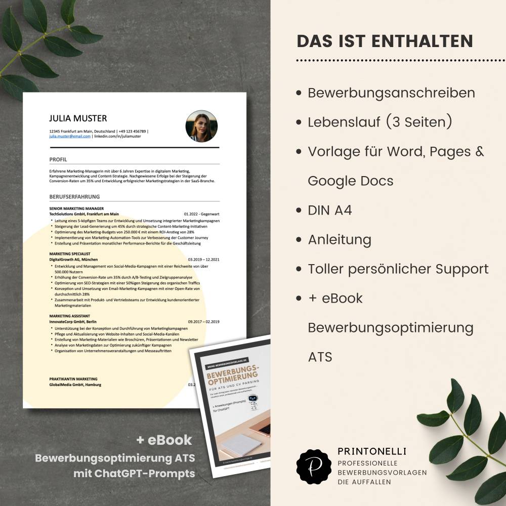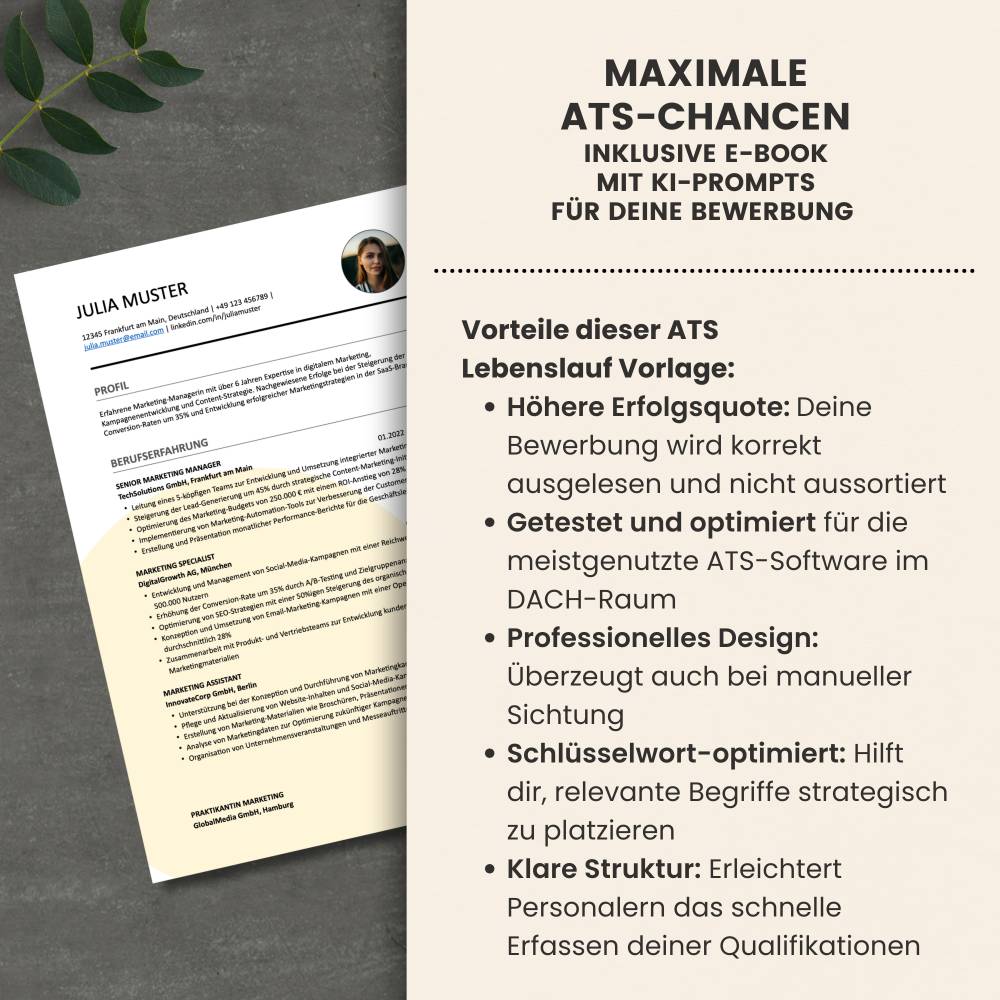 Stell dir vor, deine Bewerbung tanzt mühelos durch die digitalen Prüfungen der Bewerbungssoftware und landet direkt im Blickfeld der Personalabteilung. Genau das ermöglicht dir diese professionell gestaltete ATS-optimierte Lebenslauf-Vorlage, ergänzt durch ein eBook mit kraftvollen ChatGPT-Prompts zur Bewerbungsoptimierung.