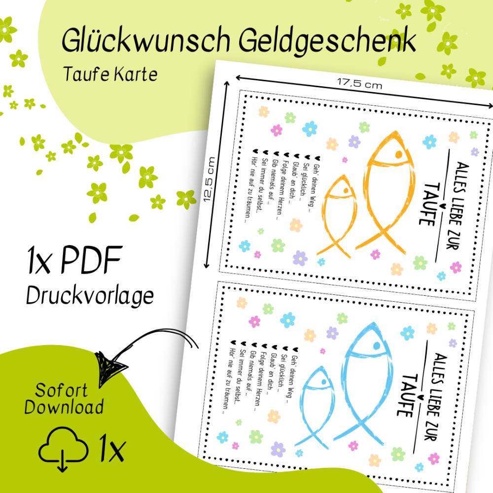 Fröhliche Glückwunschkarte zur Taufe für ein Geldgeschenk als Bastelvorlage, Druckvorlage zum selber ausdrucken - einfach und schell umsetzbar - auch ohne Bastel-Gen ;)