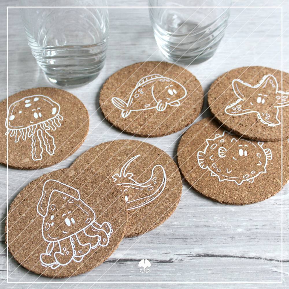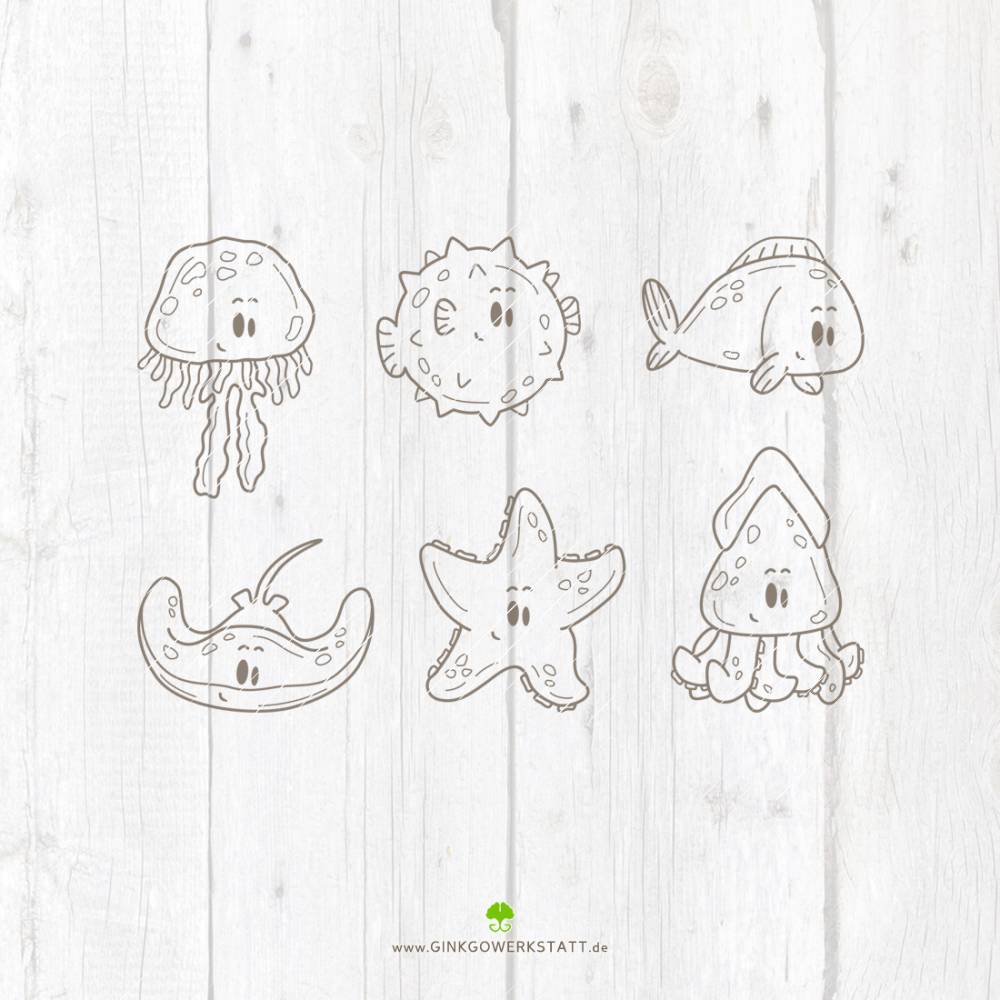 Mit der Doodle "Meerestiere" - Plotterdatei holst du dir gleich fünf lustige Meerestiere nach Hause. Qualle, Rochen, Fisch, Seestern, Kugelfisch und Krake machen nicht nur auf Textilien eine gute Figur. Sie eignen sich auch auch zum Dekorieren von Strandaccessoires oder von Möbeln und Gegenständen im Bad. Aber am liebsten begleiten sie natürlich kleine Kinder beim nächsten Ausflug zum Strand oder in den Urlaub an's Meer.