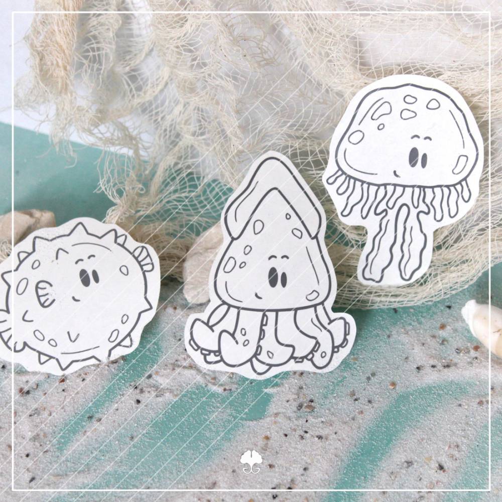 Die fünf Meeresbewohner gibt es nur als Outline. Die Konturen-Plotts eigenen sich sehr gut zum Ausmalen mit z. B. Textilmalfarben. So können die Kleinen ihre ganz eigenen Varianten kreieren. Da darf auch gerne mal über den Rand gemalt werden, um ganz individuellen Kreationen der süßen Tiere zu bekommen.